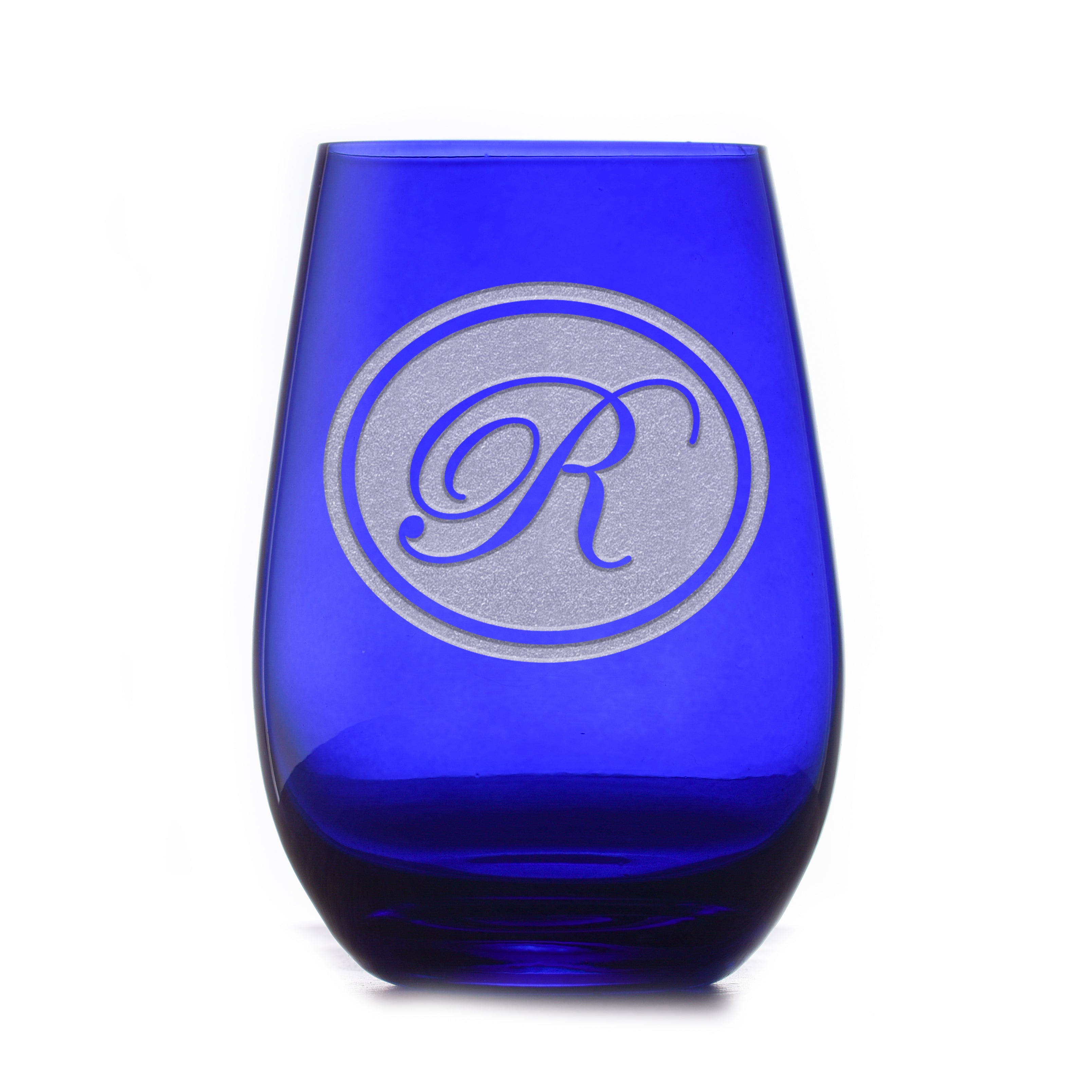 Custom etched blue stemless wine glass tumbler. This Stolzle Elements 16.5 oz. china blue tumbler, deeply etched and personalized by Crystal Imagery will be the gift you will love to give or get! Custom engrave your monogram or company logo while delivering the quality you've come to expect from Stolzle. Crystal Imagery prides ourselves with providing a deep-relief, 3D finish when we custom engrave your barware gifts. Our artisans use a sand-carving method that canÕt be matched by laser engravers and etchers. We blast away a background panel around the monogram or logo to create a finish that is jaw-dropping.This glassÕs organic color is what sets the Elements collection apart from traditional table settings. It's beautiful and natural at once, giving your table and party a splash of color for a bold new look. Use it to serve wine, cocktails, soft drinks, and water. The versatile size makes it a favorite for nearly every occasion.
