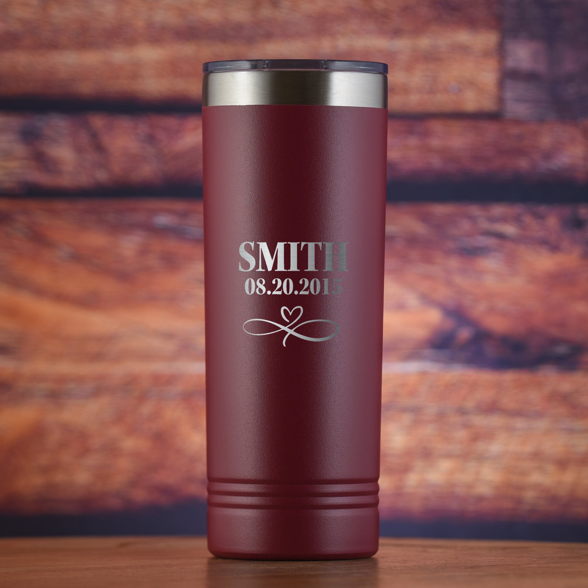 Personalized skinny insulated tumbler with slider lid is the best wedding favor gift. Best wedding reception favor or a gift for the bride and groom or happy couple for the big day. Our skinny travel tumbler is perfect for hot coffee or cold beverages on the run and fits most cup holders in your car, jeep or truck. The opening in the lid is also big enough for a straw! We selected these Polar Camel 22 oz. slim insulated tumblers for their high quality and durability. We laser etch our custom designs into the powder-coated monogrammed yeti style tumbler, which creates the design in a sleek stainless steel finish.