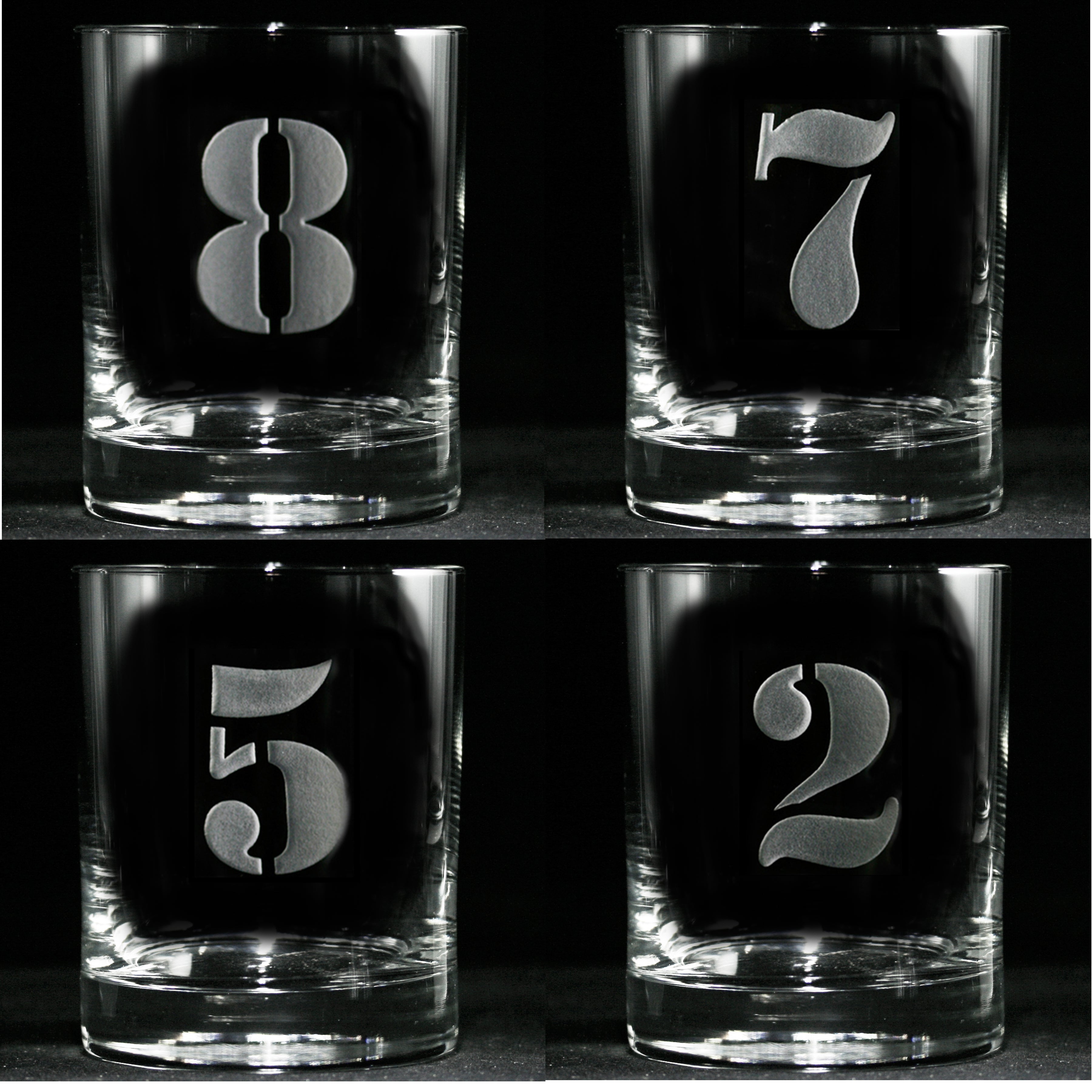 Engraved Numbered One through Eight Whiskey Glass Set is a great way to keep track of your own drink at the party. Whether you enjoy scotch, bourbon or whiskey, these numbered glasses will help you enjoy life in style. Deeply carved using our sand carving technique, each whiskey, scotch, bourbon glass is meticulously custom made to order making it the perfect gift for those seeking unique gift ideas for whiskey lovers - men and women alike. At 4.25" high x 3.4" wide, our whiskey glasses and scotch glasses hold 13.5 oz. A set of these etched whiskey glasses will be the favorite gift at any special gift giving occasion..