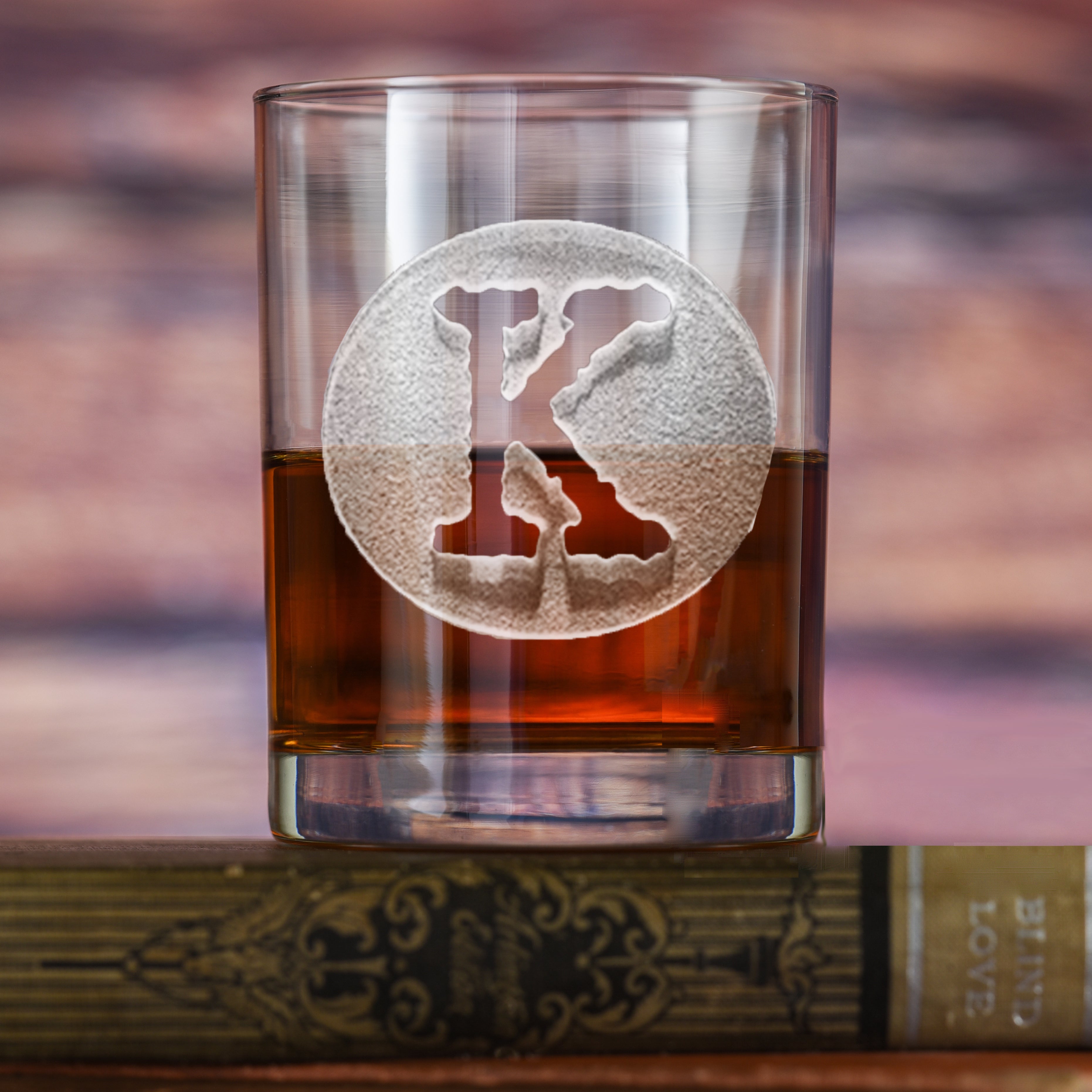 Engraved Rocks Glasses. The popular typewriter font is used to give our custom engraved scotch whiskey glass a timeless retro or vintage appeal. With the current popularity of steampunk design or industrial design, this vintage type font will fit right in on your industrial loft style bar cart. Our master sand carvers will deeply carve the background panel out of the rocks glass so the initial is left raised from the bourbon glass surface. This gift is the one that will make jaws drop!