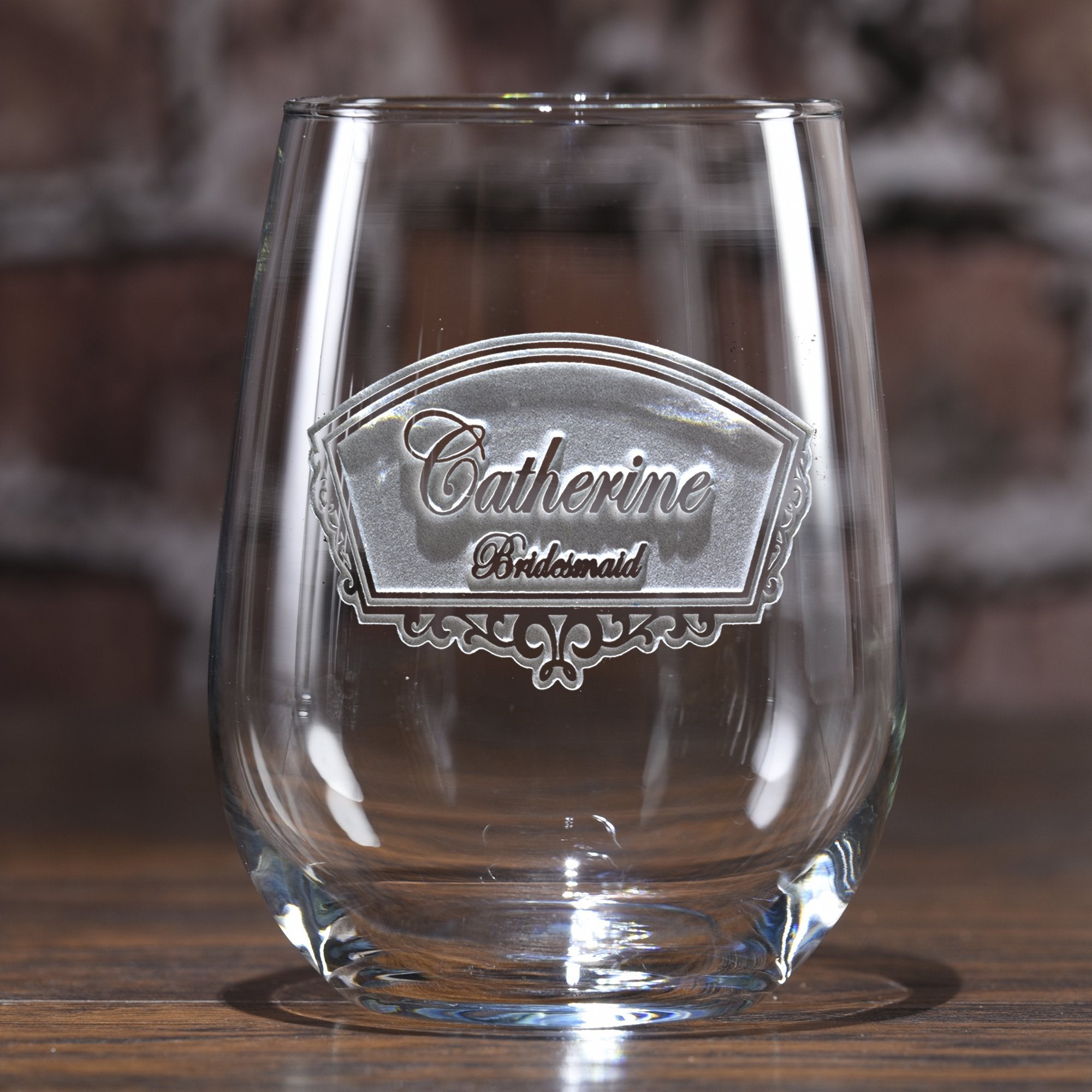 Bridesmaid stemless wine glass for the Bridesmaids, Maid of Honor, Matron of Honor, Mother of the Bride, Mother of the Groom and Bride stemless wine glasses are engraved with both the title of your attendant and her name, making these bridal party stemless wine glasses the perfect bridesmaid gift idea. These wedding party stemless wine glasses are stunning with their deeply engraved background panel that is carved away to leave the words and design raised from the glass surface. Price break will be given as each item is added to the cart. First select the title, then insert the name and hit order. Then continue with each additional title and name and when each one is added to the cart, your quantity price break will activate, bringing the individual price per glass down. These beautifully carved bridal party gifts are truly a keepsake gift to show your appreciation to your bridesmaids and maid of honor and is perfect for use during the wedding reception and for that special toast to the bride and groom. These engraved bridesmaid wine glasses are a gift she will cherish for years to come. Our stemless wine glass measures 4.5" high and holds 16 oz. of your favorite vino. Dishwasher safe. (*NOTE: We have matching groom and groomsmen wine glasses, too!)