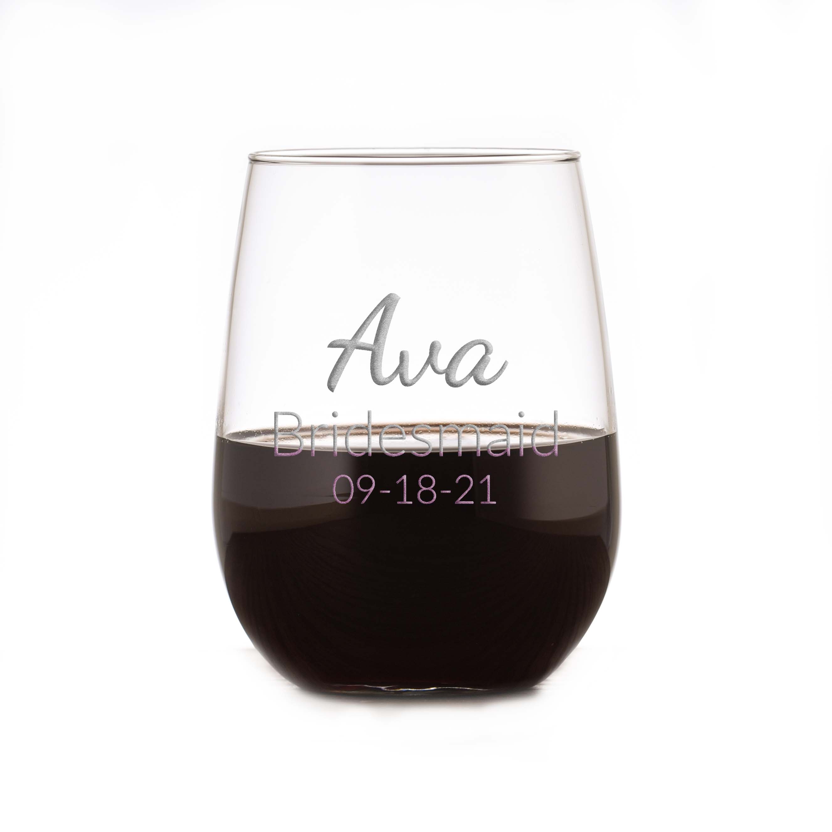 Bridesmaid Personalized Stemless Wine Glass Gift. Bridal party gifts should show your wedding party attendants just how much you appreciate them. Our engraved wedding stemless wine glasses are made by a unique sand-carving method that leaves a 3D effect that makes jaws drop! Engraved glasses and etched glasses can't touch the high quality of our custom designed bridal party wine glasses, making them a unique wedding attendant gift that is unmatched in quality. Your bridesmaids and maid of honor will use their custom wine glass for many years. Personalized with the bridesmaid's name and wedding date. At 4.75" high by 4" wide, our custom stemless wine glass holds 16 oz of your favorite wine in style. Dishwasher safe. Made in the USA. Price per item will lower in your cart as each item is added to the cart.