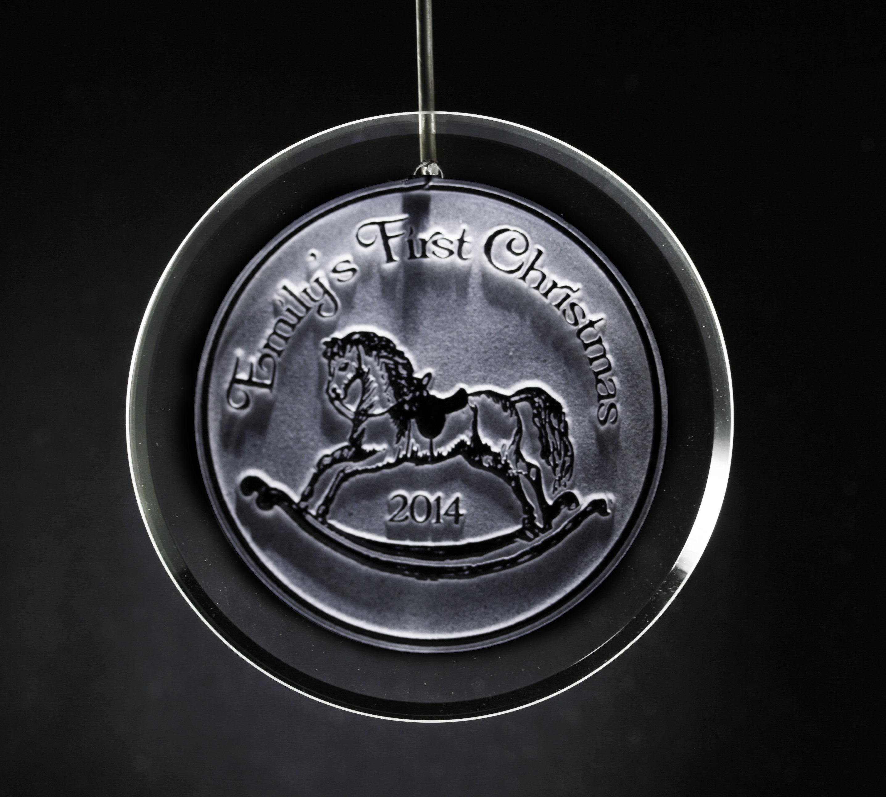 Baby's First Christmas Glass Ornament. Baby's first Christmas is such a special day in any new parent's life. Commemorate this occasion with a beautifully hand-crafted carved glass ornament that can be hung on the tree for generations to come. Featuring baby's first name with "First Christmas", a beautiful antique rocking horse and baby's year of birth, making this a truly custom keepsake ornament.