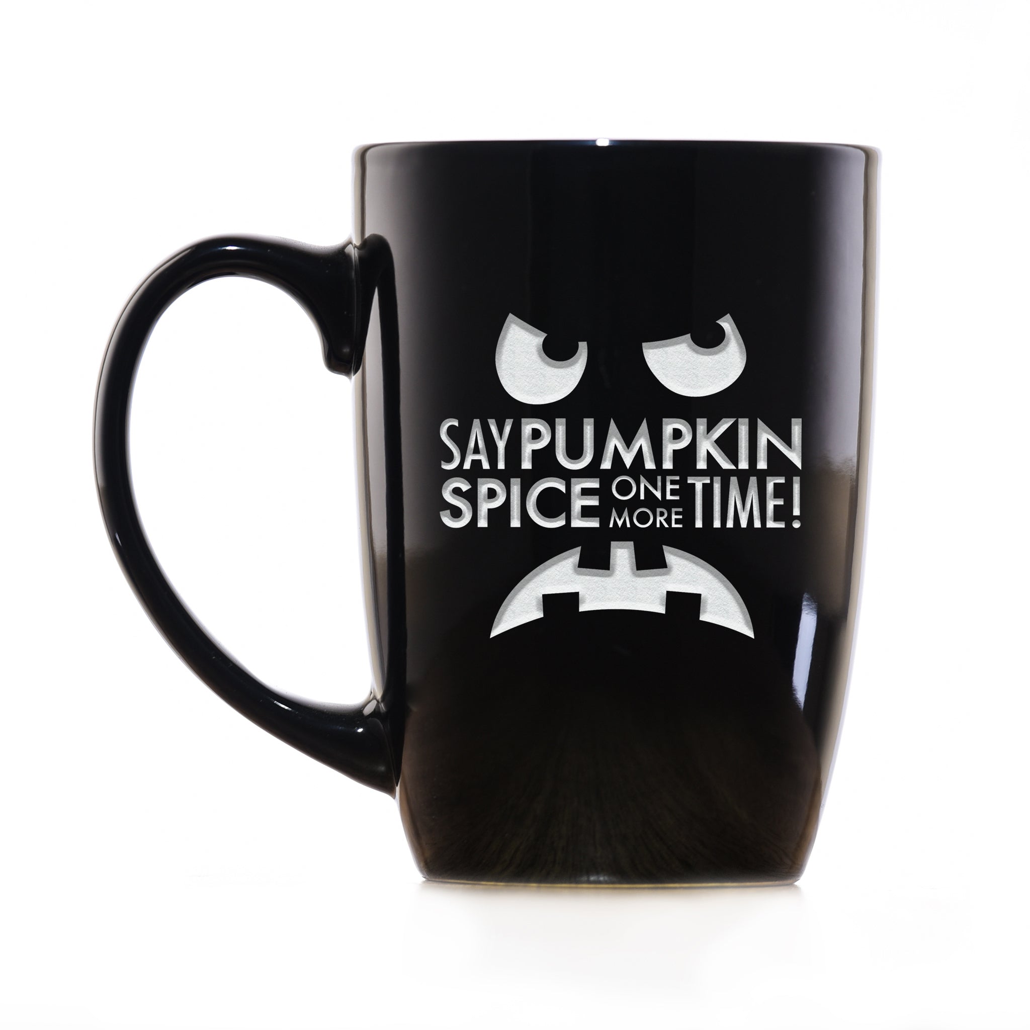For the anti-pumpkin spice crowd, those who absolutely despise or hate any and all things pumpkin themed, we offer the ÒSay Pumpkin Spice One More Time" set of glassware and coffee mugs. Featuring a frowning jack-lantern, these glasses and mugs will be a hit with those who totally hate all things pumpkin spice.