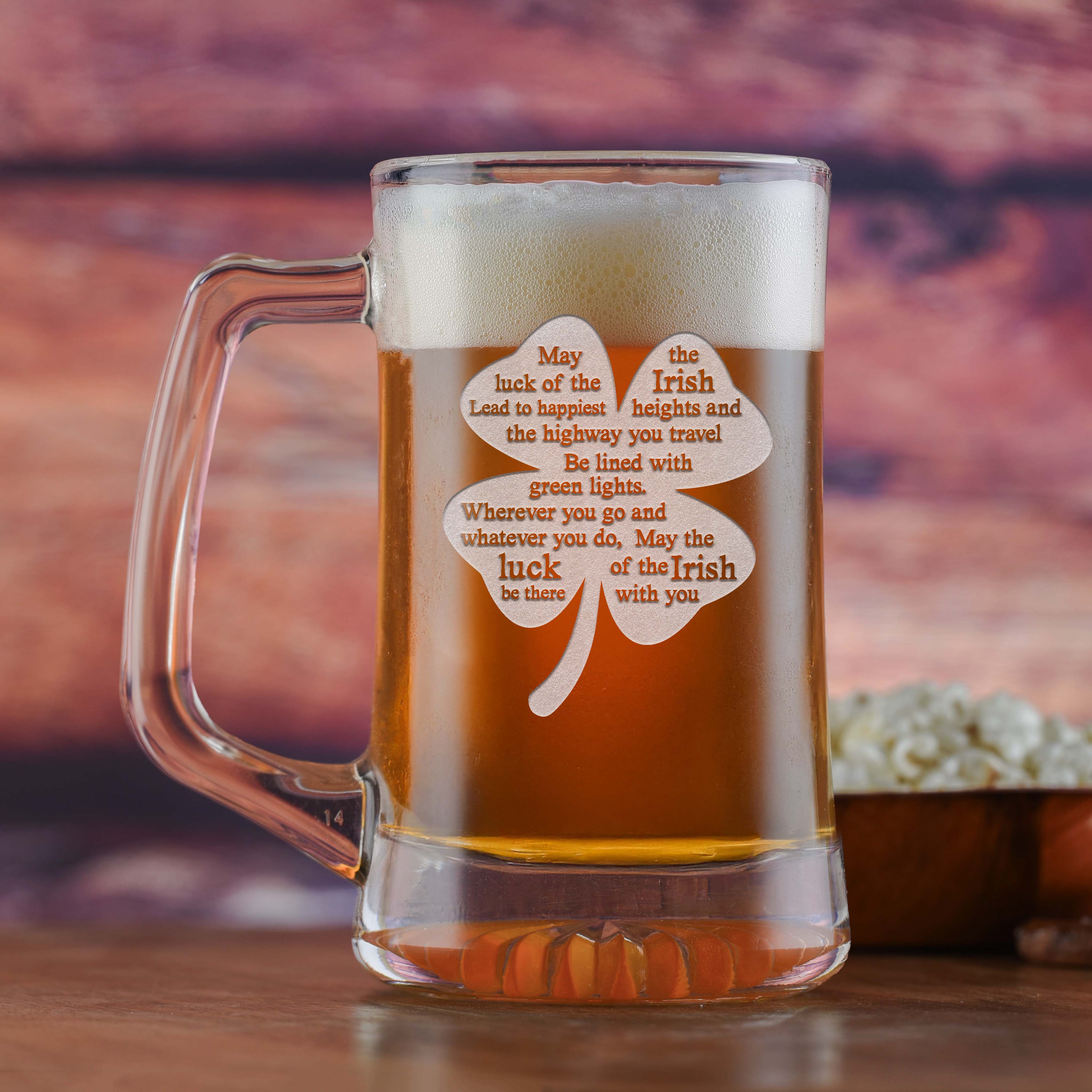"May the luck of the Irish lead to happiest heights, and the highway you travel be lined with green lights. Wherever you go and whatever you do, may the luck of the Irish be there with you!" This Irish prayer or toast is perfect whether you're toasting at a St. Patrick's Day party or at a wedding or special occasion with friends. Our St Patty's Day beer mug and barware collection is going to be a hit with your Irish friends. The four leaf clover or shamrock features the old Irish prayer quote inside. Our beer mugs are not etched or engraved, but are sand-carved by our master carvers. Each Irish beer mug is meticulously hand-crafted by carving out the background panel, leaving the lettering raised from the glass surface in a beautiful 3 dimensional manner.