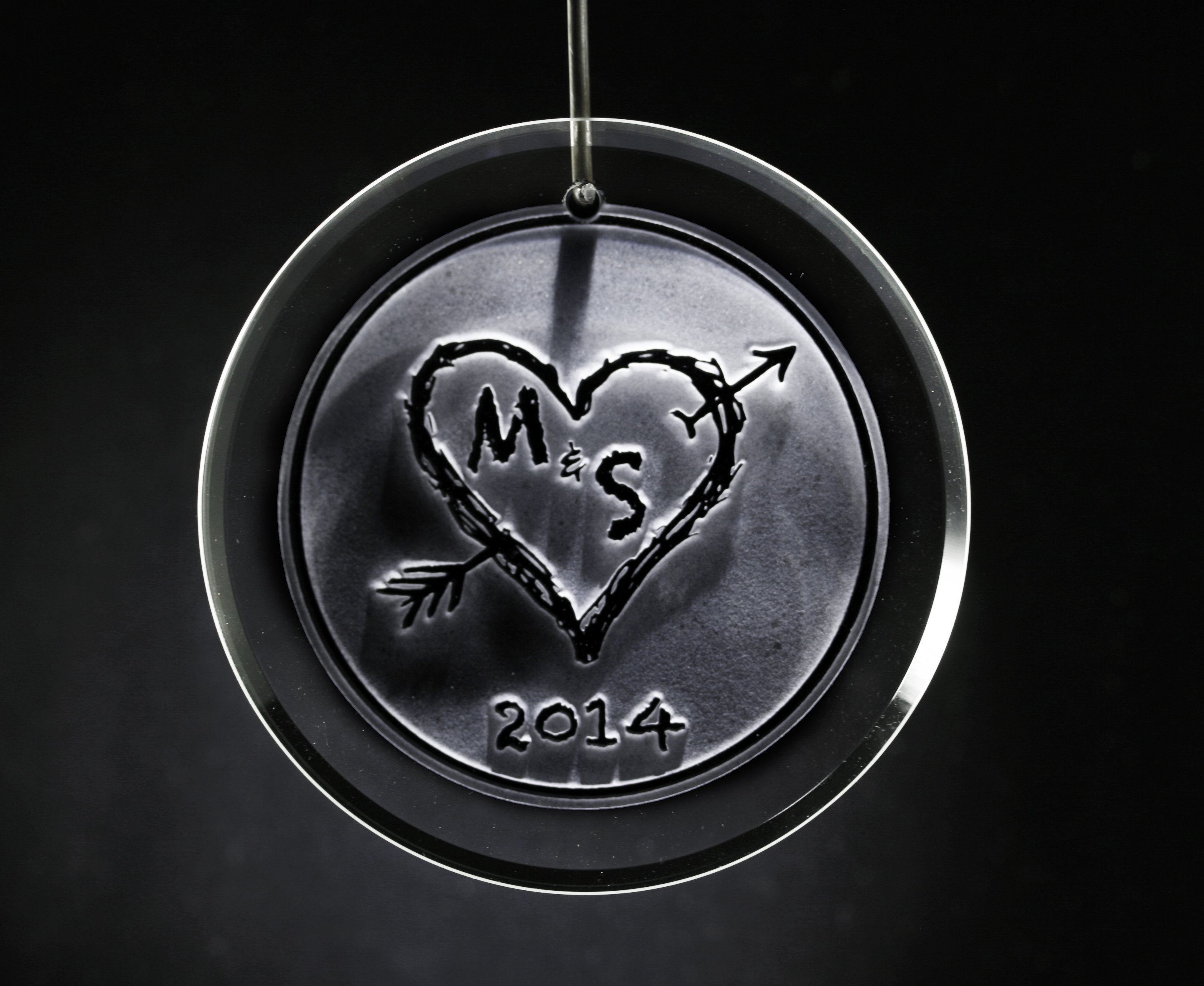 Our master glass carvers hand craft each ornament by carving the background out of the glass while leaving the heart with arrow and initials untouched and raised from the ornament's surface in a beautiful 3d embossed manner.