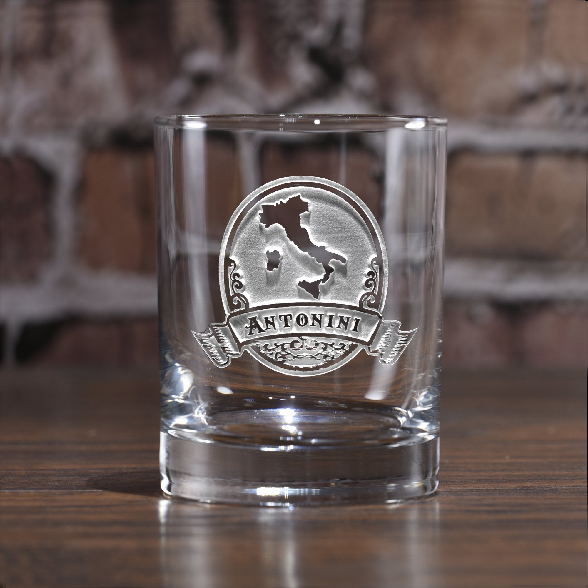 Proud of your Italian heritage? We've got a beautiful set of Italian whiskey glasses, scotch, beer mugs, goblets and more to help you celebrate your Italian pride in style! Our beautifully hand carved scotch glasses feature a stunning background panel that is meticulously carved away leaving the peninsula of Italy raised from the scotch glass in a beautiful 3D manner. A flowing name banner features your last name (surname) to personalize this Italian bourbon glass for you. Our Italian themed barware makes a perfect wedding toasting glass set for a traditional Italian wedding or give a set as a wedding or anniversary gift to a special Italian couple. Famiglia is really important to our Italian friends so a set of glassware with the family name featured so beautifully would be the most appreciated gift for any recipient for any special occasion.