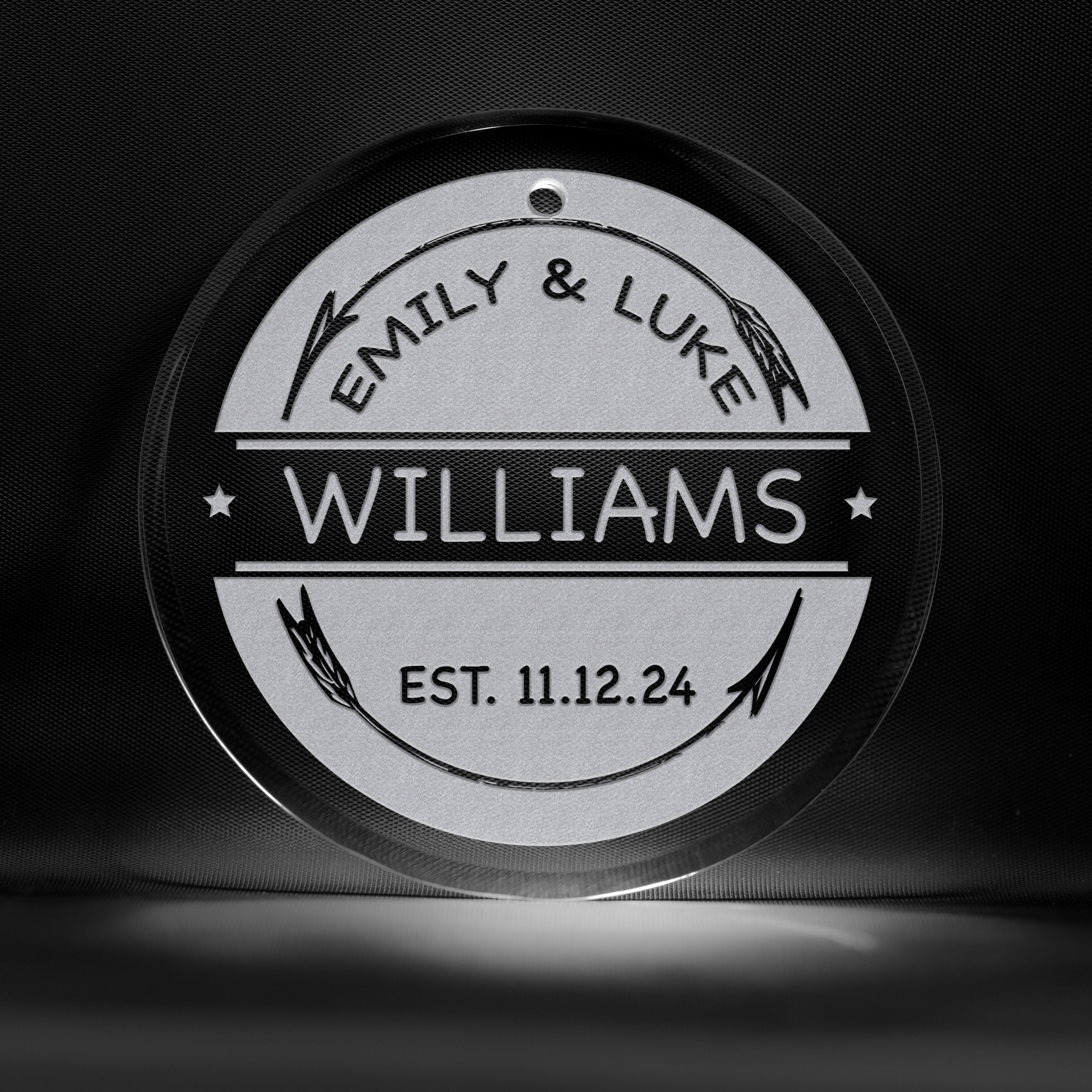 Personalized Rustic Arrows Christmas Ornament. Our engraved Rustic Arrows glass ornament makes a cool Christmas gift, wedding gift idea, anniversary gift, housewarming gift, or a gift for any special occasion. Personalize this custom couple Christmas glass ornament with the couples' names across the top banner, their last name in the center banner, and their date of marriage or union across the bottom. Featuring a rustic set of vintage arrows, this design is right on trend with today's modern family eclectic style.