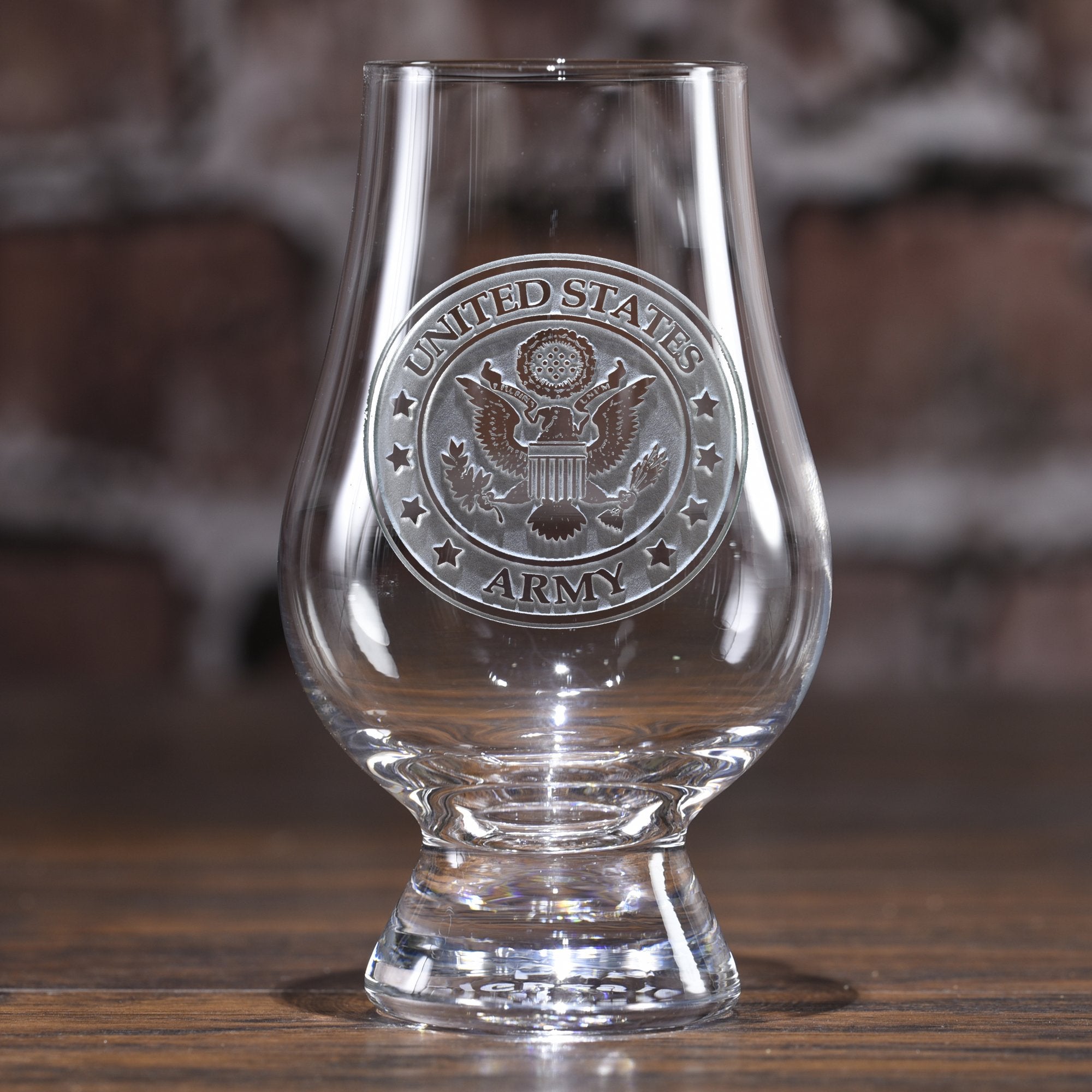 Custom engraved Glencairn Army scotch whisky glasses are a cool gift for Navy military personnel for retirement or to commemorate an officer promotion. Deeply carved using our sand carving technique, each Glencairn whiskey, scotch, bourbon glass is meticulously custom made to order making it the perfect gift for those seeking unique gift ideas for whiskey lovers - men and women alike. The Army Glencairn Whisky Glass is a revolutionary whisky glass that really lets one savor the taste and complexity of fine scotch whisky. These are great to use for Single Malt Whisky, Irish Whiskey, and also your single barrel bourbons. With the tapered mouth, you are able to really smell all of the nuances the whisky has to offer. Any malt connoisseur will love this Army whiskey glass of the highest quality! Made for the whiskey connoisseur, our personalized monogram engraved Glencairn whiskey glass is the ultimate thoughtful gift for that man who has everything and loves the finer things in life. The glasses are 2.5 inches wide and 4.5 inches tall and holds up to 6.5 ounces. The tapering mouth allowed for an ease of drinking whilst capturing the all-important aromas. The wide crystal bowl enhances the appreciation of the whisky's colour whilst the solid base is designed to be easy in the hand but robust enough for the discerning regular whisky drinker. This truly makes this "The Official Whisky Glass". These Army glasses are the Official Glencairn Glasses from the Glencairn Crystal factory in Scotland. The bottom of each glass is engraved with "The Glencairn Glass".
