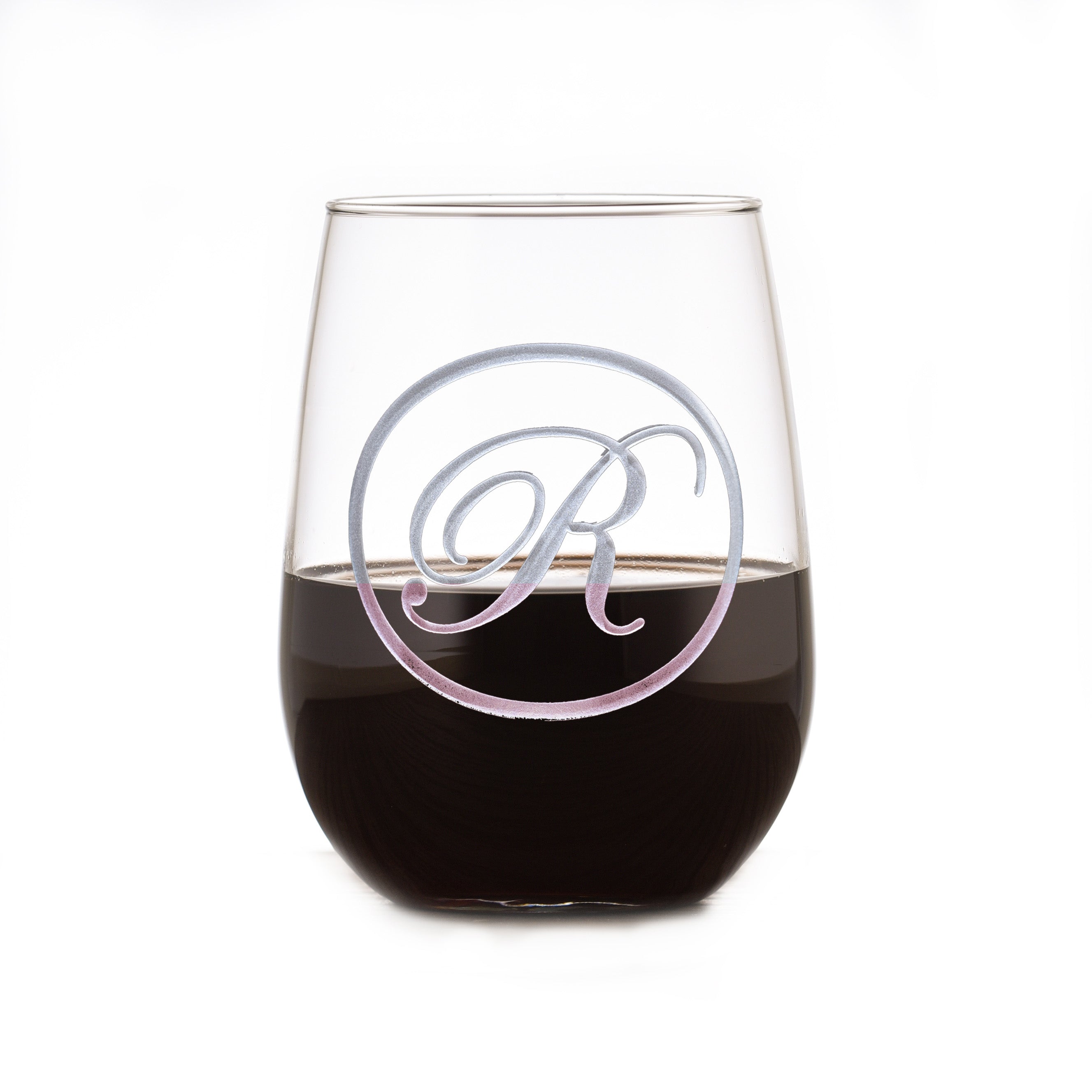 Our engraved minimalist wine glass features a classic traditional Edwardian Script font monogram centered in a simple and classic circle design. A thoughtful and unique gift idea for wedding, bridal shower, anniversary, new home gift and birthdays or anniversaries. A unique gift that will be cherished for many years! At 4.5" high our custom stemless wine glass holds 16 oz of your favorite wine in style. Dishwasher safe.