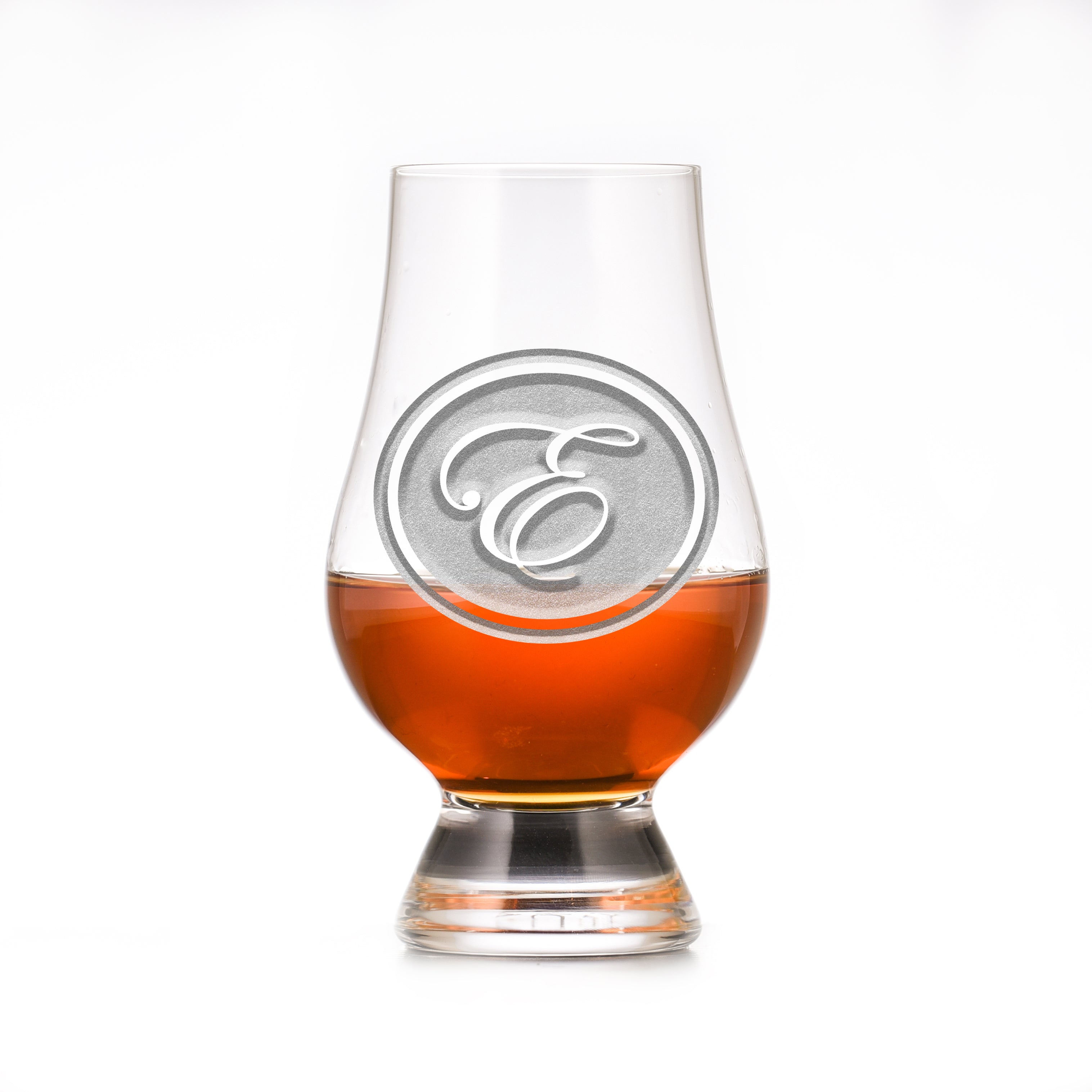 The engraved Glencairn Scotch Glass with monogram background design with your initial proudly displayed in a classic Edwardian Script font in the center. This gorgeous gift for the bride and groom, anniversary couple, or for any man or woman, will be a used and appreciated for years to come. This custom monogrammed scotch snifter glass is meticulously hand carved by our master carvers and trained artisans to create a stunning 3D finish on your scotch glass that is unmatched by simple surface engraving or etching.
