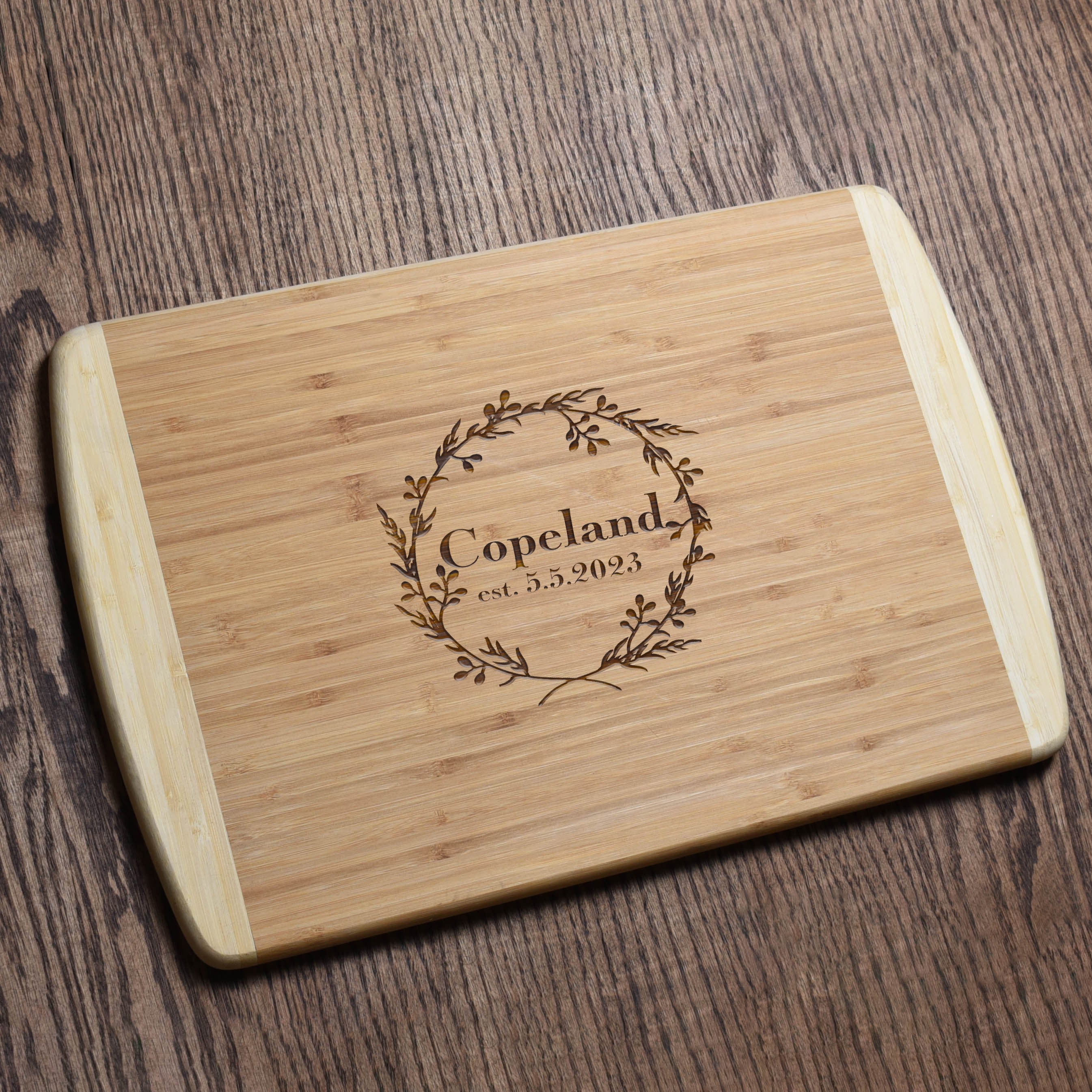 Wedding Gift Bamboo Two Tone Cutting, Charcuterie & Cheese Board. Beautifully crafted 13 1/2" x 11 1/2" natural bamboo cutting board. Gorgeous two tone coloring and can be laser engraved for personalization. Fill in your name and date for a wedding or anniversary celebration. Or choose from our many other personalized monograms and wedding anniversary gift themed designs.