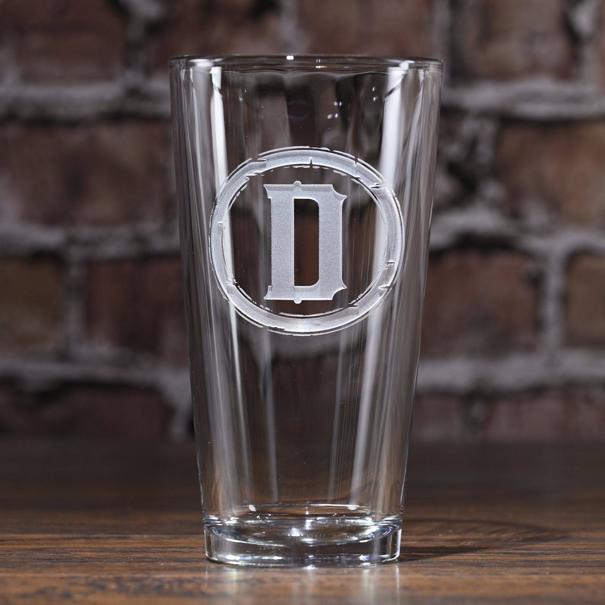 Hand crafted and deeply sand carved in the USA by our master sand carvers, your monogram is meticulously engraved into this sturdy pint pub glass which is perfect for as a water glass, beer glass or iced-tea glass. Give a set of these pub glasses as a memorable wedding gift or anniversary gift. Need a hostess gift or housewarming gift? Give our monogrammed pint glasses and your gift recipient will be thrilled. Measures 6' high by 3.5' wide. At 16 oz, our pub glass will hold plenty of your favorite beverage. Dishwasher safe. Made in the USA.