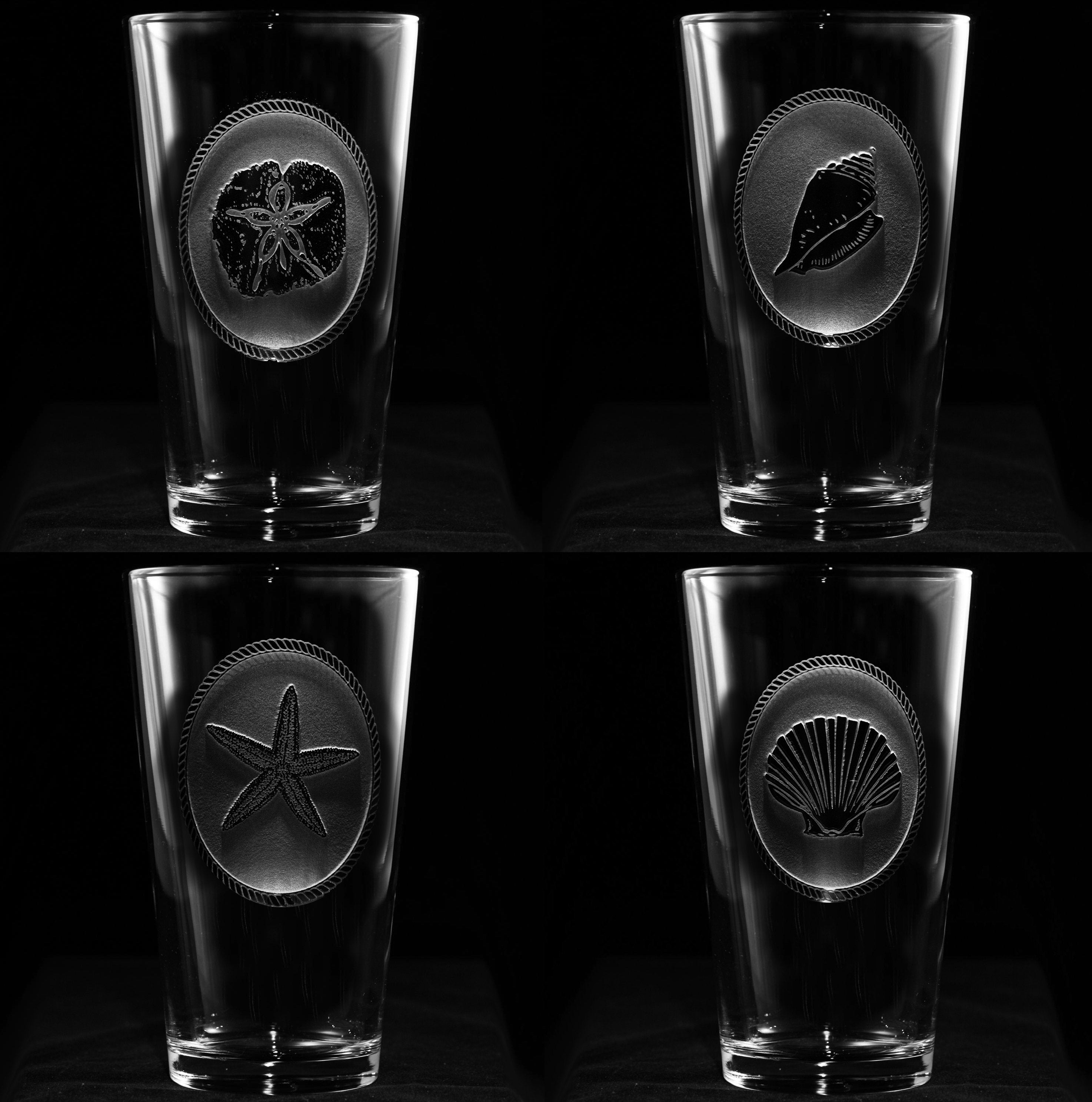 Seashell Drinking Glasses. Seashell motif beach house glassware set is what every coastal home needs to complete their theme and entertain their guests in style. Elegant and classic, our seashell pint glasses feature four different seashells including a conch shell, a scallop shell, sand dollar and a starfish. Anyone who loves beach home decor will want a set of our beach themed glassware to complete their home bar, to use in the kitchen or to complete a basement bar or man cave.