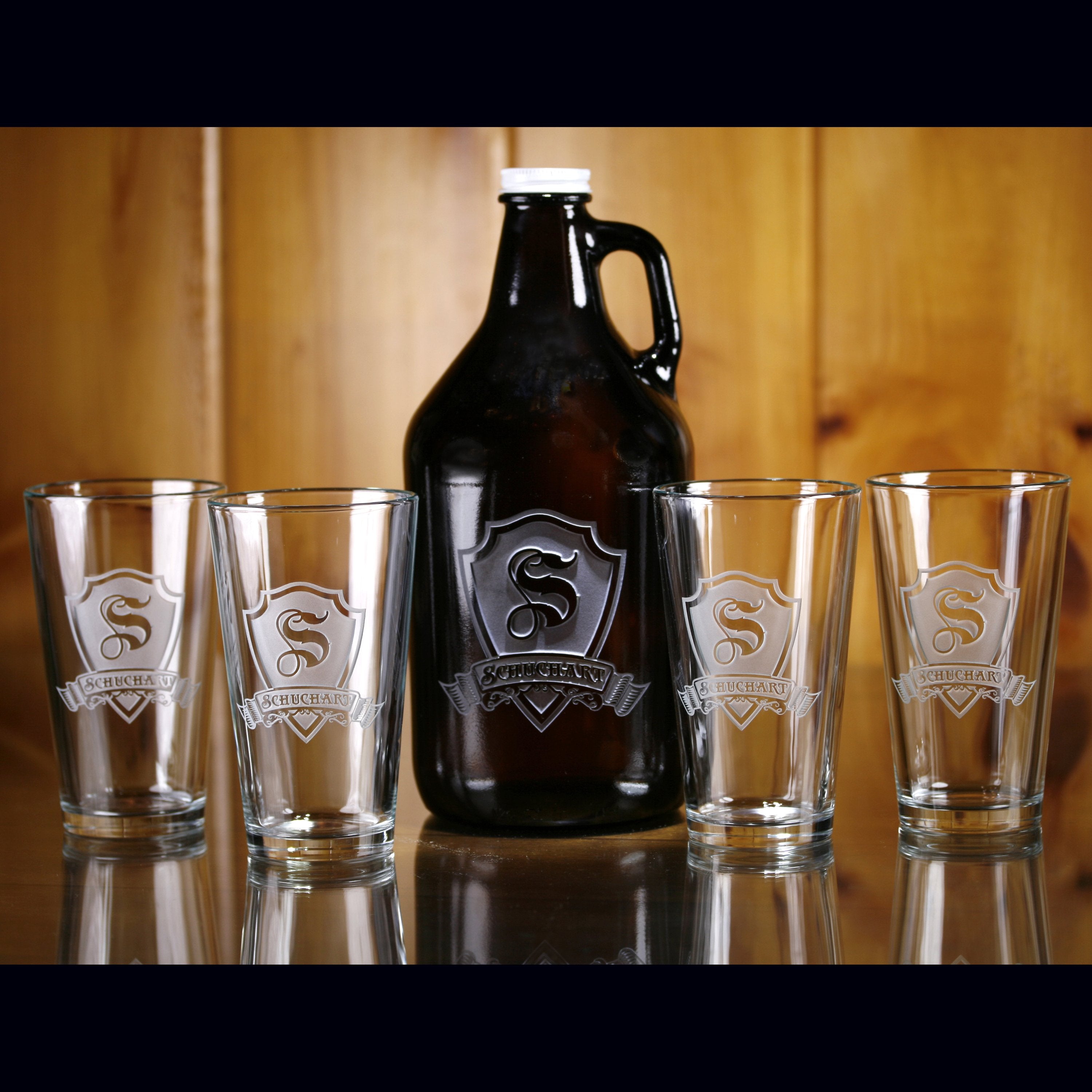 Beer Growler and Pint Pub Glass Set of 4. Our custom engraved amber glass beer growler and pint pub glass set is the perfect gift for the home brewing enthusiast. You ll be quite the brew master by meeting your beer bottling needs with our custom engraved and personalized brown beer jug and glasses.
