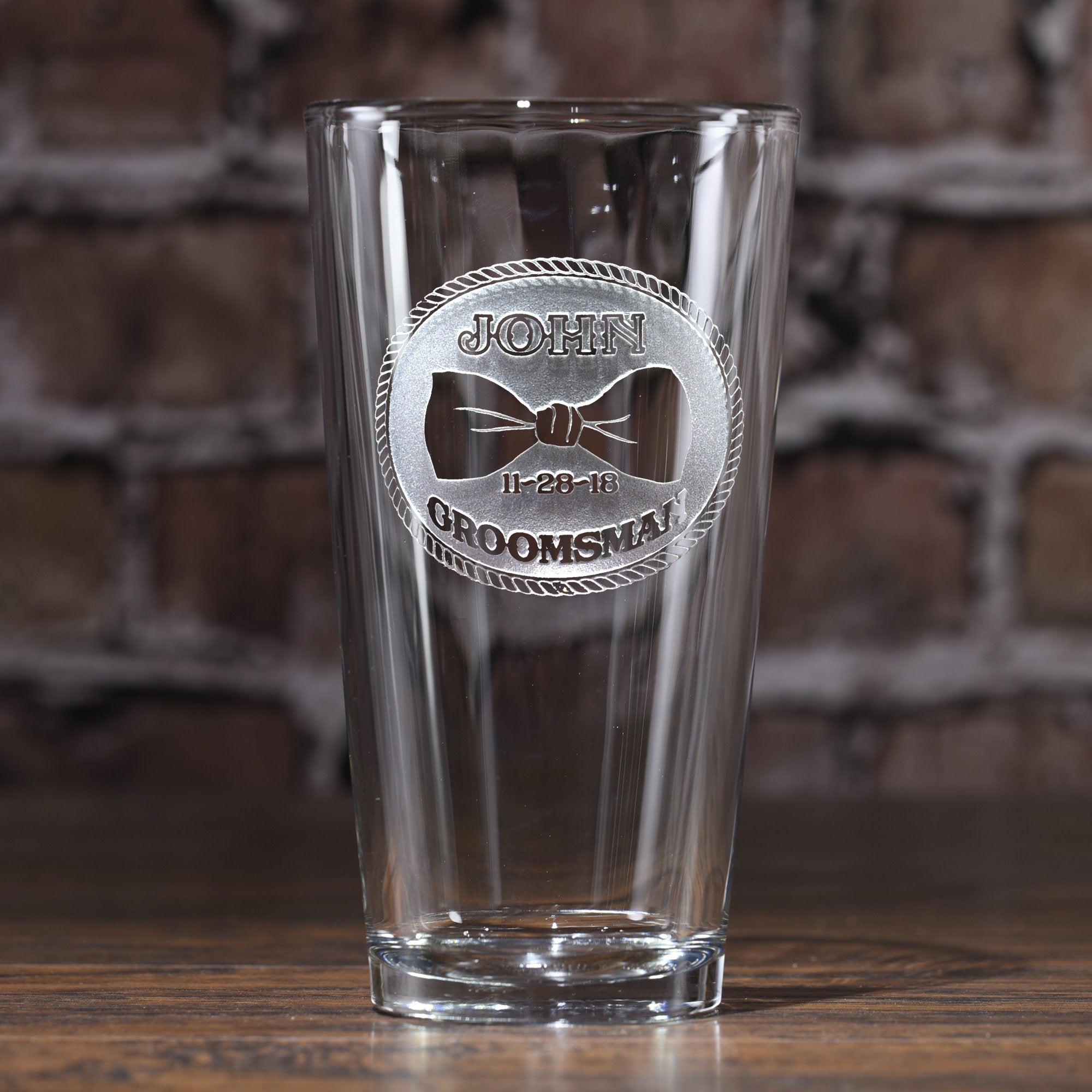 Groomsmen bow tie beer glasses such as our pint pub glass, makes a thoughtful gift for your best man and wedding party attendants. This engraved beer glass is custom made to include your wedding date, the title of your groomsman and his name to make this engraved glass gift one that he will use over and over again. These personalized beer glasses for groomsmen, bridesmaids and special wedding party members are stunning with their deeply engraved background panel that is carved away to leave the words and design raised from the pilsner glass surface. Price break will be given as each beer glass is added to the cart. First select the title, then insert the name and wedding date, and hit order. Then continue with each additional date, title and name and when each one is added to the cart, your quantity price break will activate, bringing the individual price per personalized groomsman pub beer glass down. These beautifully carved wedding party beer glasses are truly a keepsake gift to show your appreciation to your groomsmen and best man and is perfect for use during the wedding reception and for that special toast to the bride and groom. These engraved best man pint glasses are an engraved groomsmen gift he will enjoy for years to come. Measures 6' high by 3.5' wide. At 16 oz, our groomsmen pint glasses will hold plenty of your favorite beverage. Dishwasher safe. Made in the USA.