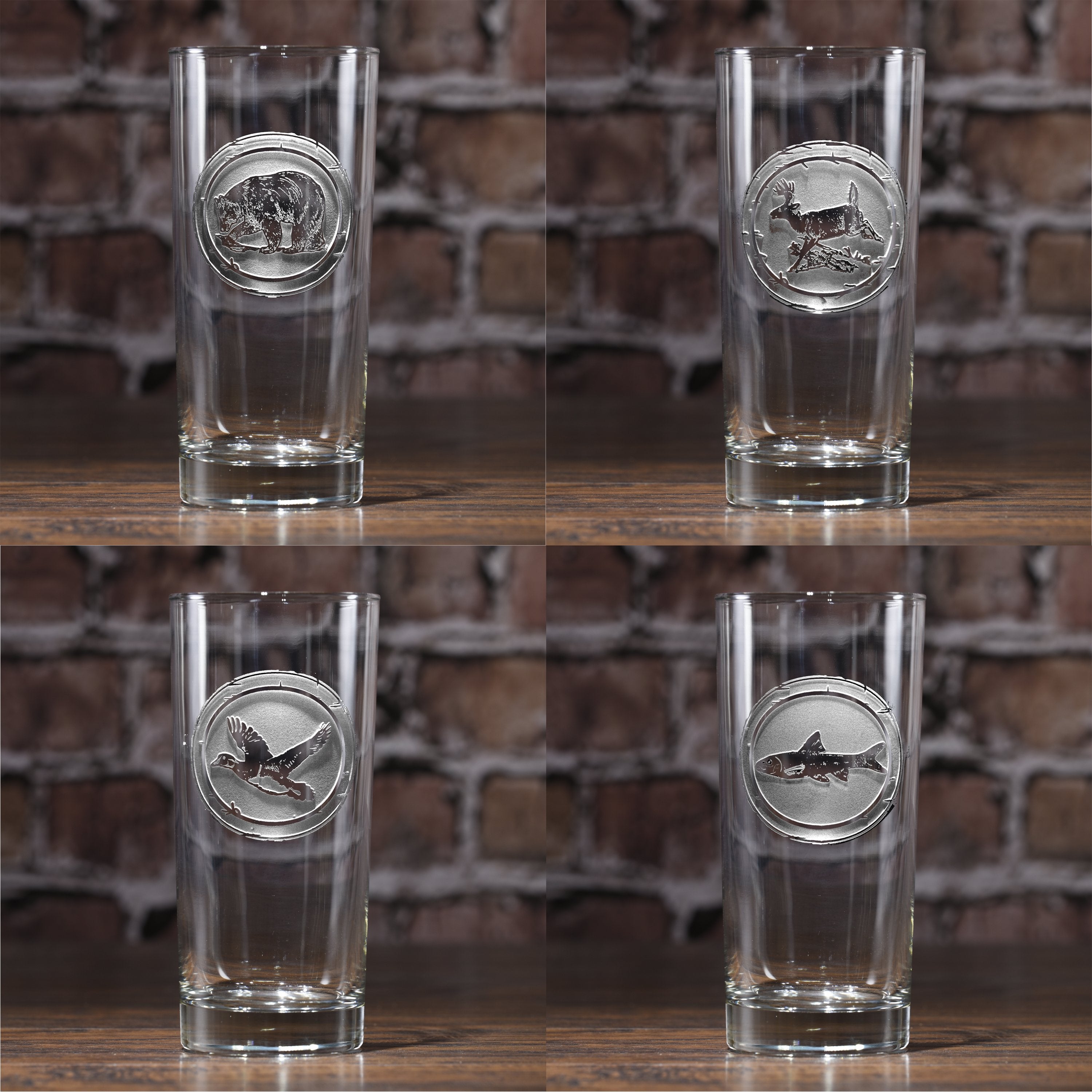 Wildlife Animals Highball Glasses. Engraved nature lover cocktail glass, cooler glass set includes bear, deer, fish and duck and is a great gift idea for the man or woman who loves animals, hunting, fishing and the great outdoors. Deeply carved using our sand carving technique, each highball glass is meticulously custom made to order making it the perfect gift for those seeking unique gift ideas for the mixed drink lover, men and women alike. Seeking a gift for your mountain retreat, lodge or cabin? This wildlife glassware set would be ideal. This wildlife highball glasses set is also perfect for the man cave or basement bar. Our 15 oz. cooler measures 6.25' tall by 3' wide. Carved in the USA. Dishwasher safe.