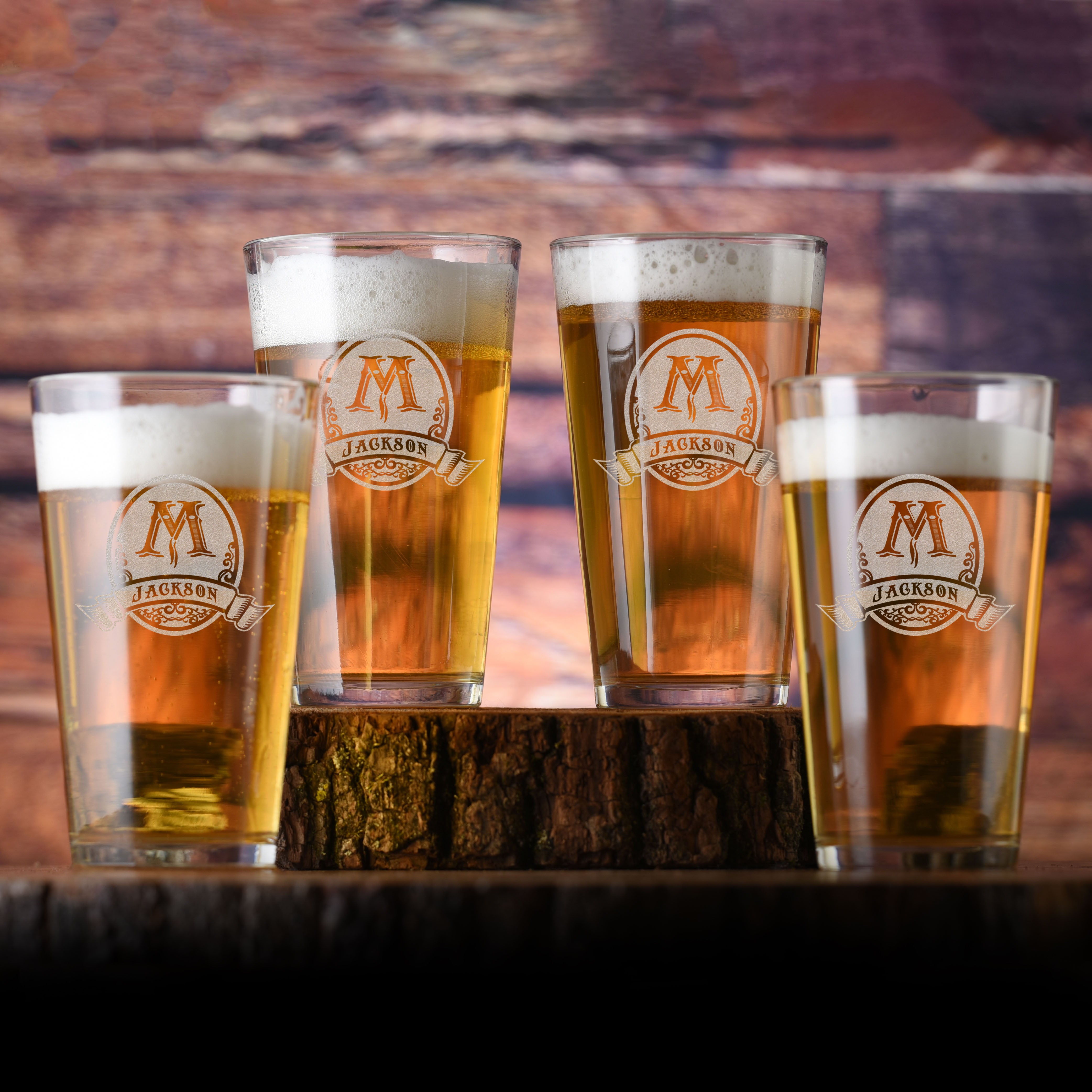 Our laser etched beer pint glass gift set includes 4 beer glasses with a custom monogram design. Simply input the name and initial for a customized gift set for the beer lover. Our oval and banner beer glass design on this set of 4 pub glasses will be the gift he or she cherishes for years to come.