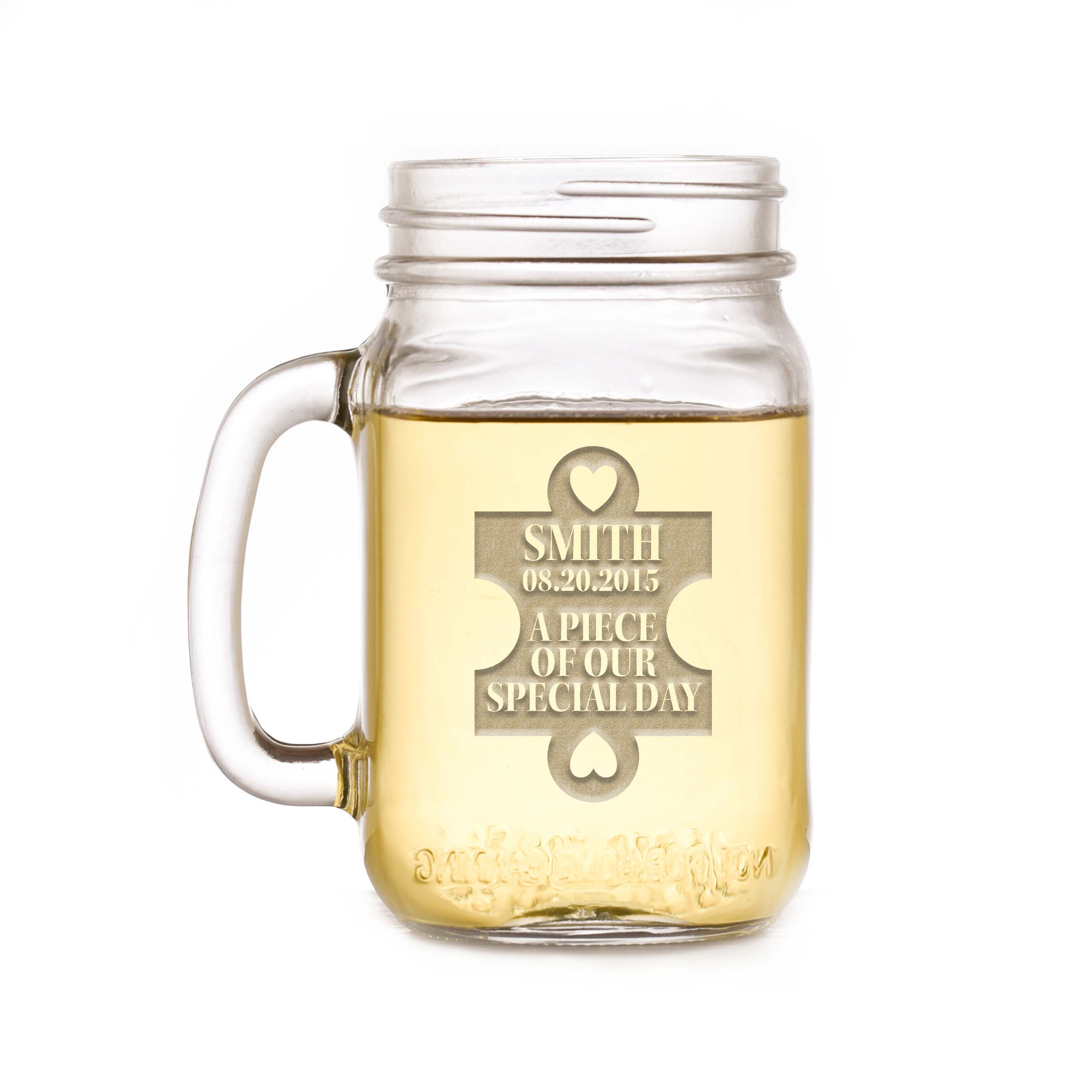 Our engraving process is actually called sand-carving. It's a unique process that blasts away a background design, leaving the monogram initials and lettering untouched and raised from the mason jar surface in a stunning 3D manner. These wedding favors and gifts are truly unique and the quality is unmatched by simple engraved and etched styles. Dimensions: top diameter: 2 5/8', bottom diameter: 2 1/2', maximum diameter: 4 1/8', height: 5 1/4', capacity: 16 oz. Made in the USA. Puzzle piece wedding favors are not recommended for use with hot beverages.