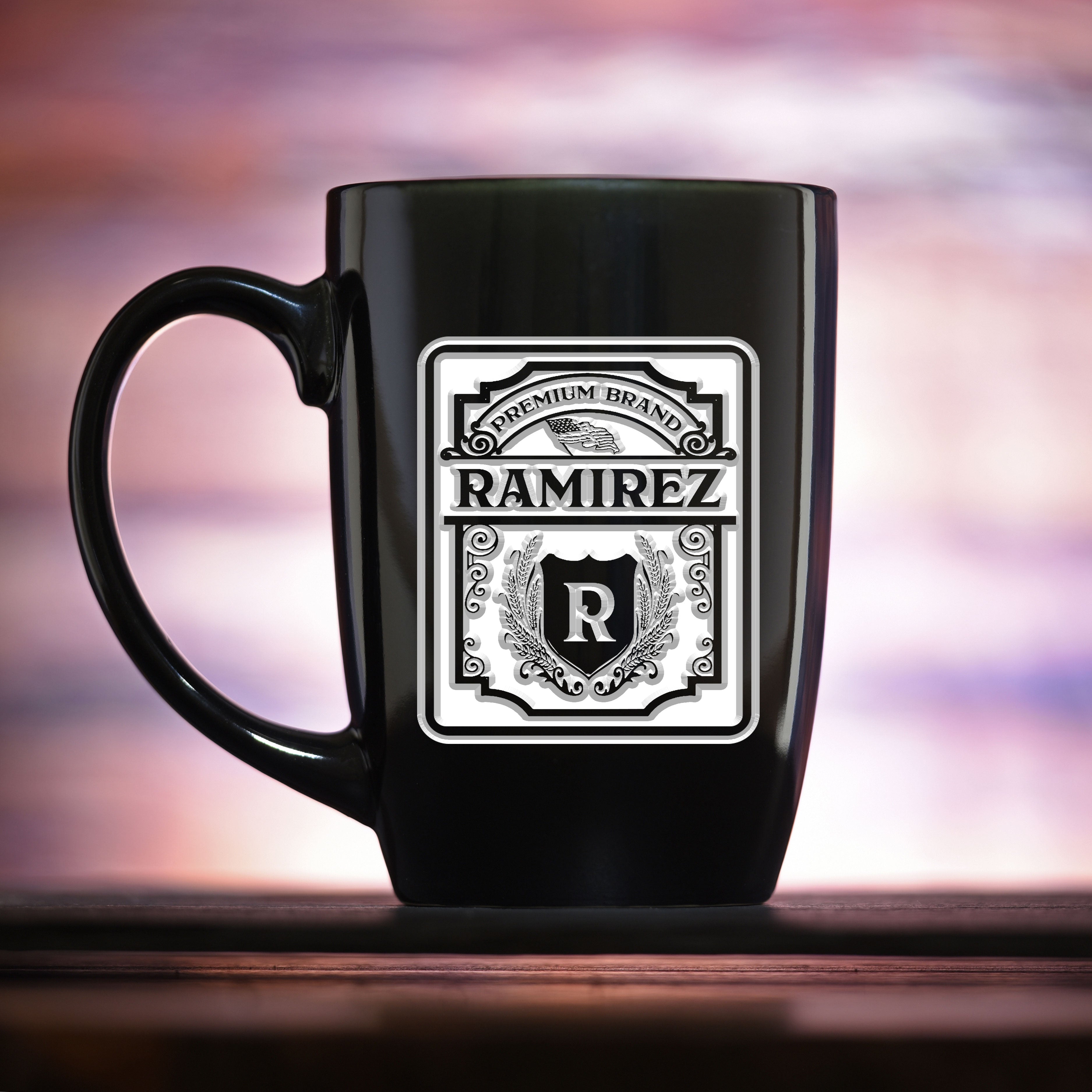 Premium Branded Coffee Cup is a cool gift for men and women and makes a great wedding gift or anniversary keepsake. Our personalized brand label design black ceramic coffee mug is custom made to order. Our master sand carvers will deeply carve the background into the mug, allowing the lettering and details raised from the coffee mug in a stunning 3D manner. The label design is created in an old world style font featuring your full last name. Our deeply carved designs are custom made by our in-house designer and are much more beautiful than a simple engraved or surface etched drinkware. Want to give the perfect unique wedding gift, bachelor gift, housewarming, birthday or thank you gift? How about a great hostess gift or boss gift? Our engraved personalized gifts by Crystal Imagery will be that unforgettable gift that is used and appreciated for years to come. At At 4 5/8" tall, our branded coffee cup holds 15 oz of your favorite coffee, espresso or cappuccino and has a high curved grip for easy grab-n-go handling..