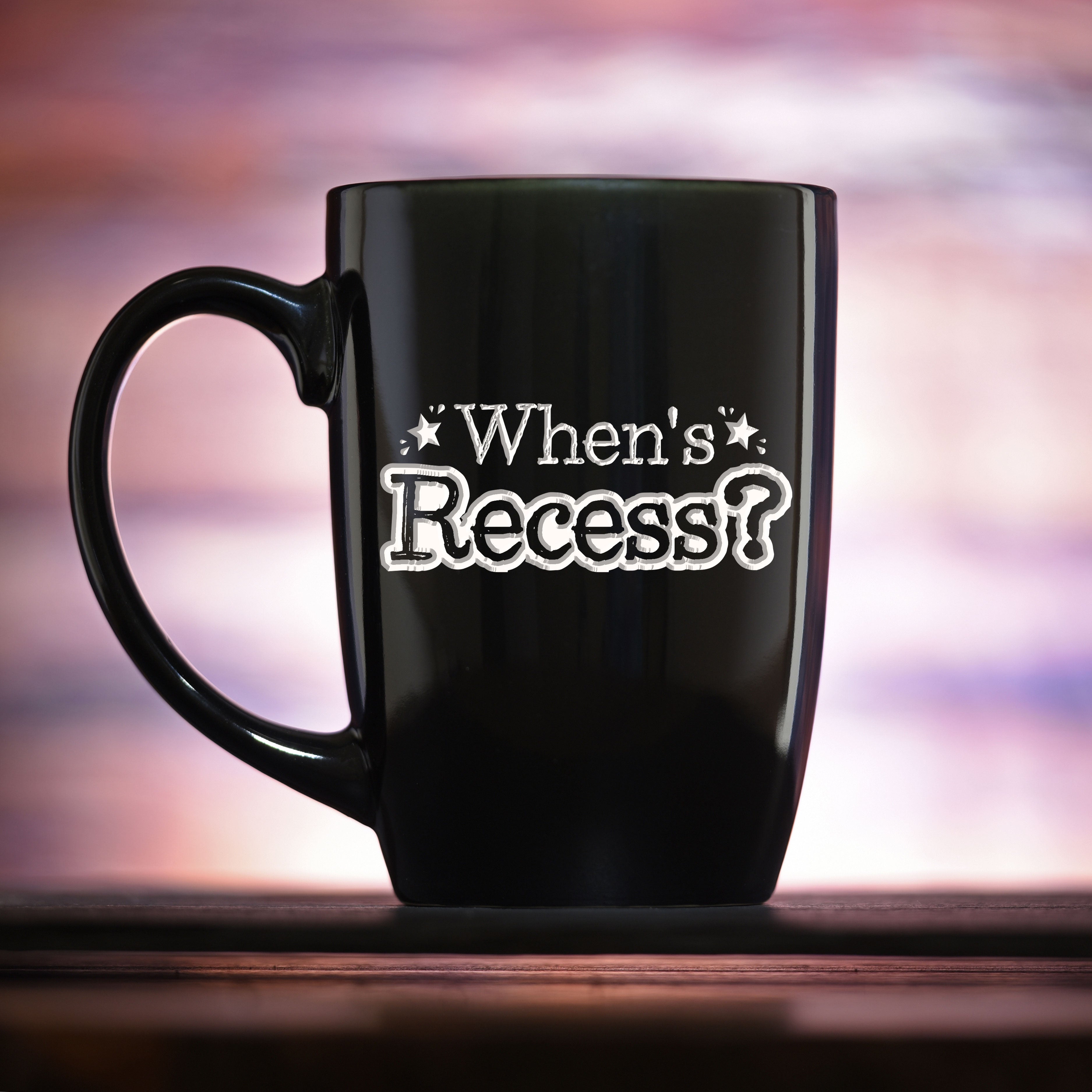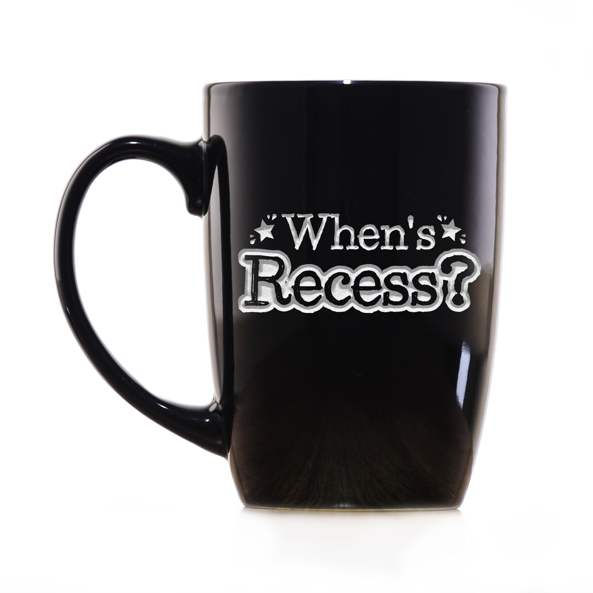 When's Recess? is our latest funny homeschool coffee mug designed for parents dealing with homeschooling their children during the Coronavirus, COVID-19 pandemic. With stay-at-home orders, parents are suddenly finding themselves acting as teachers to their children, which could drive anyone a little crazy! This homeschool mom coffee mug could also be a great Teacher Appreciation Gift for your favorite teacher at Christmas time or the end of the school year as a thank you gift. We are offering this new design to help you share your misery and show your sense of humor. As always, we can ship this direct to your friends for you with an enclosed gift note. This new funny homeschool mom/teacher coffee mug pandemic design is also available as a stemless wine glass. Social Distancing gifts. At 4 5/8" tall, our custom engraved glossy mocha stoneware homeschool mom mug holds 15 oz of your favorite coffee, espresso, or cappuccino and has a high curved grip for easy grab-n-go handling.