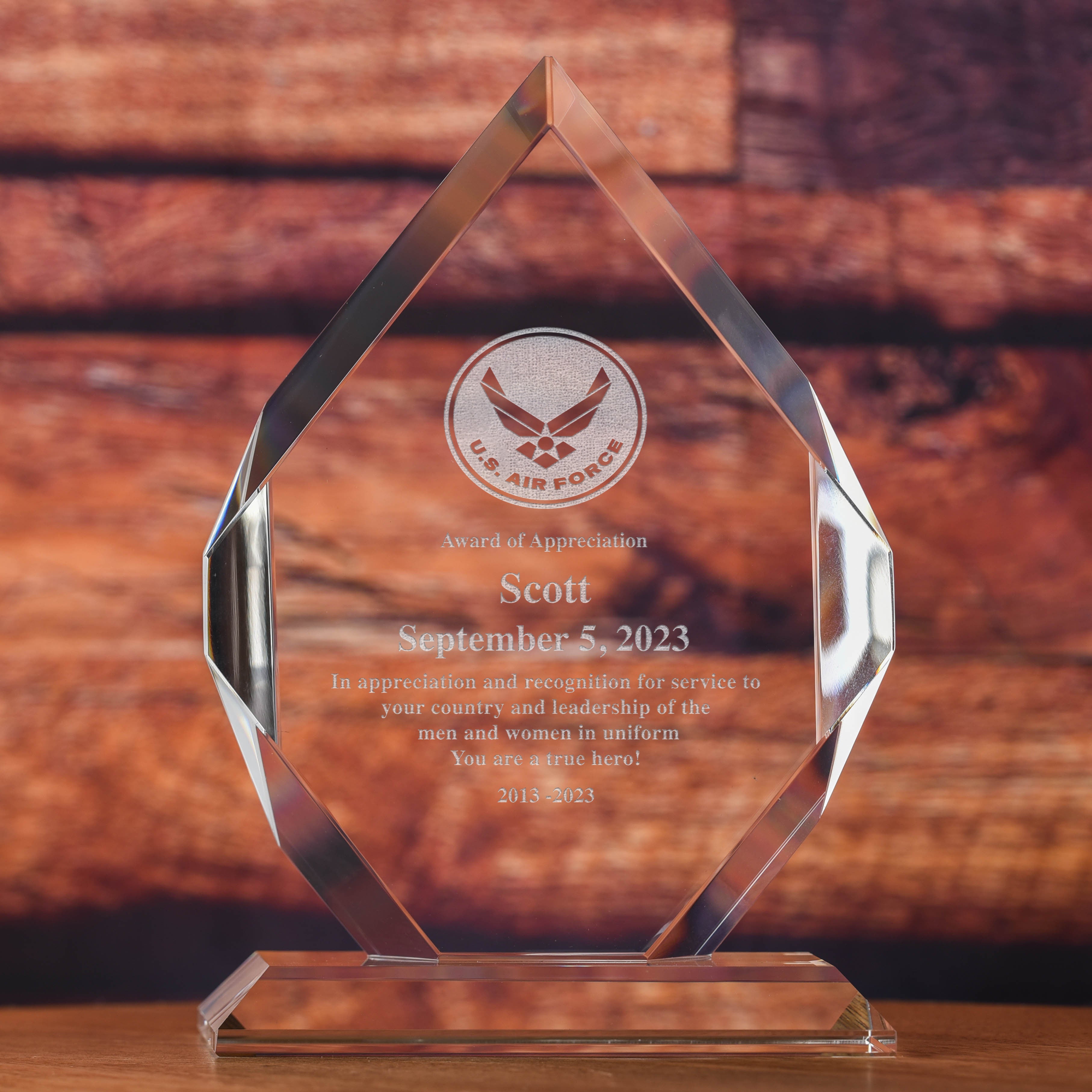 Our Military award is beautifully deep etched into this optic crystal diamond desktop award, and is the best award you could give your recipient. This is also a perfect gift for the Army, Navy, Air Force or Marines officer or enlisted who have made a difference in the lives within your community and for our country. Those who have served deserve our thanks and appreciation.