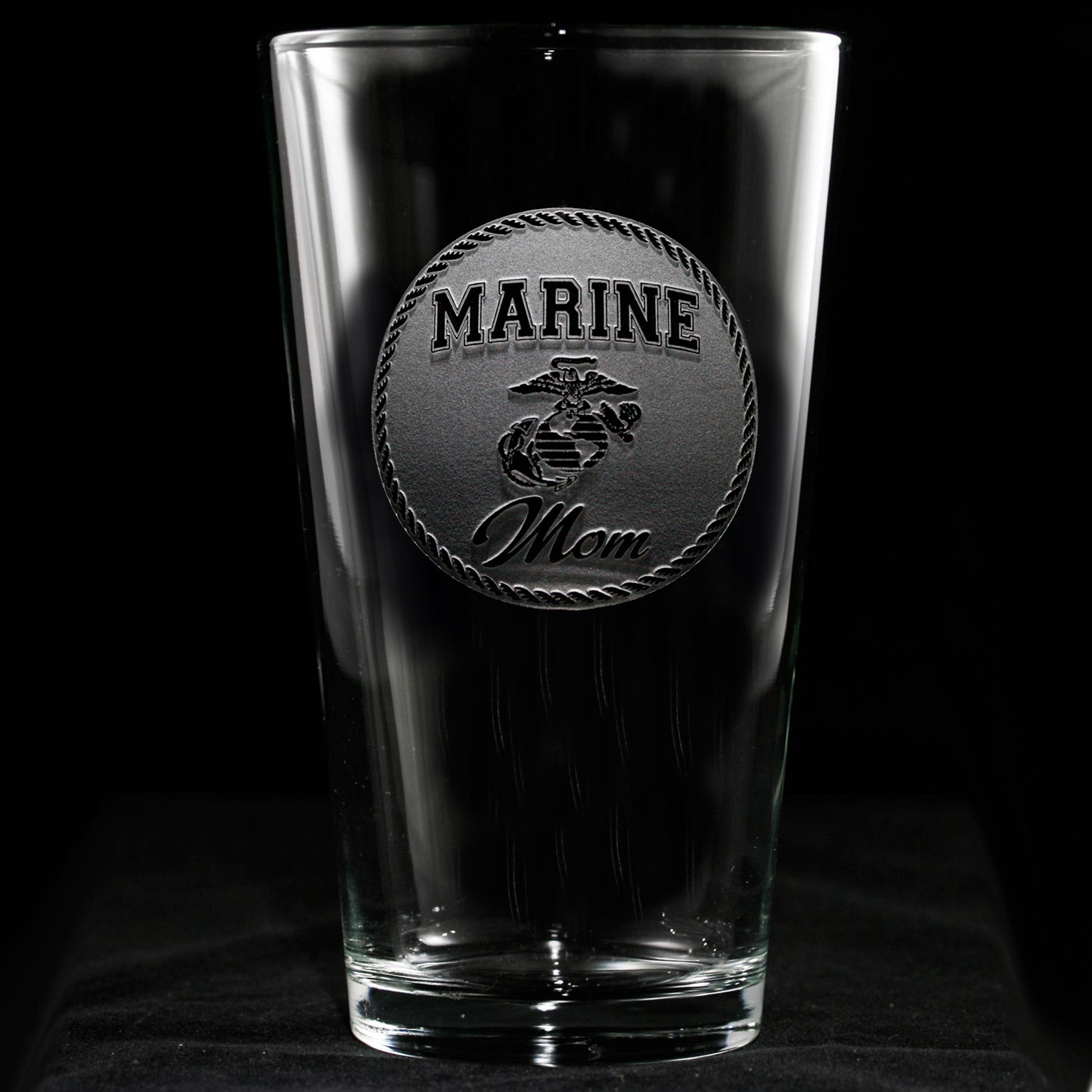 Deeply carved using our sand carving technique, each Marine Mom pint beer glass or iced-tea glass is custom made to order. A set of these etched pint beer glasses will be the favorite gift at any special occasion, for her birthday, an anniversary, a housewarming gift or gift for the Marine Mom whose child is deployed. Dishwasher safe.