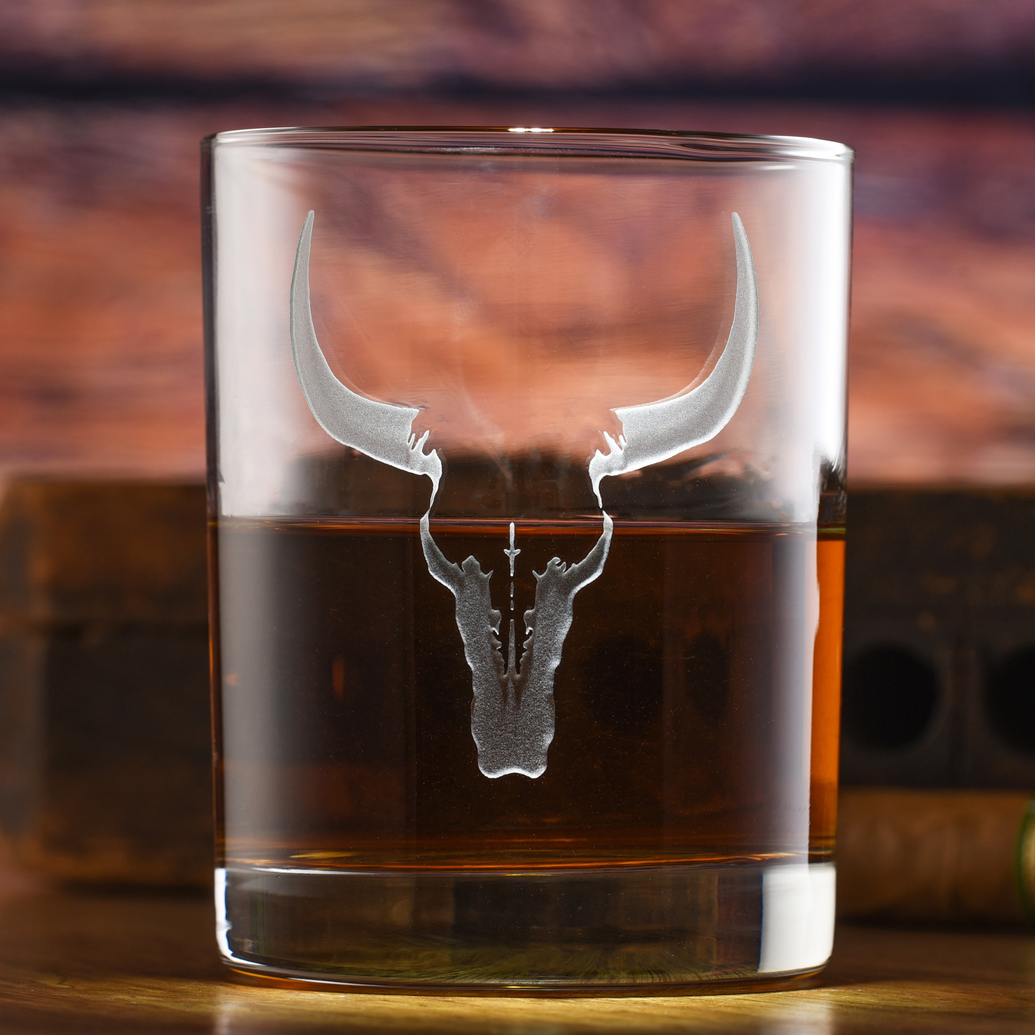 Texas Longhorn Steer Skull rocks glass set is an engraved DOF glass. A unique Texas Longhorn gift for him or her and anyone who loves hunting, farm animals, longhorn steer or bull designs, and time in nature. Crystal Imagery sand-carves our barware. This finish is far superior to traditional laser etching and engraving. Our engraved Texas Longhorn skull gift set features 2 stunning rocks glasses with a deeply engraved design that leaves a stunning deep relief, 3D finish. Our 4.25" High, 3.4" wide, 13.5 oz rocks glass set of 2 is dishwasher safe. Made in the USA.
