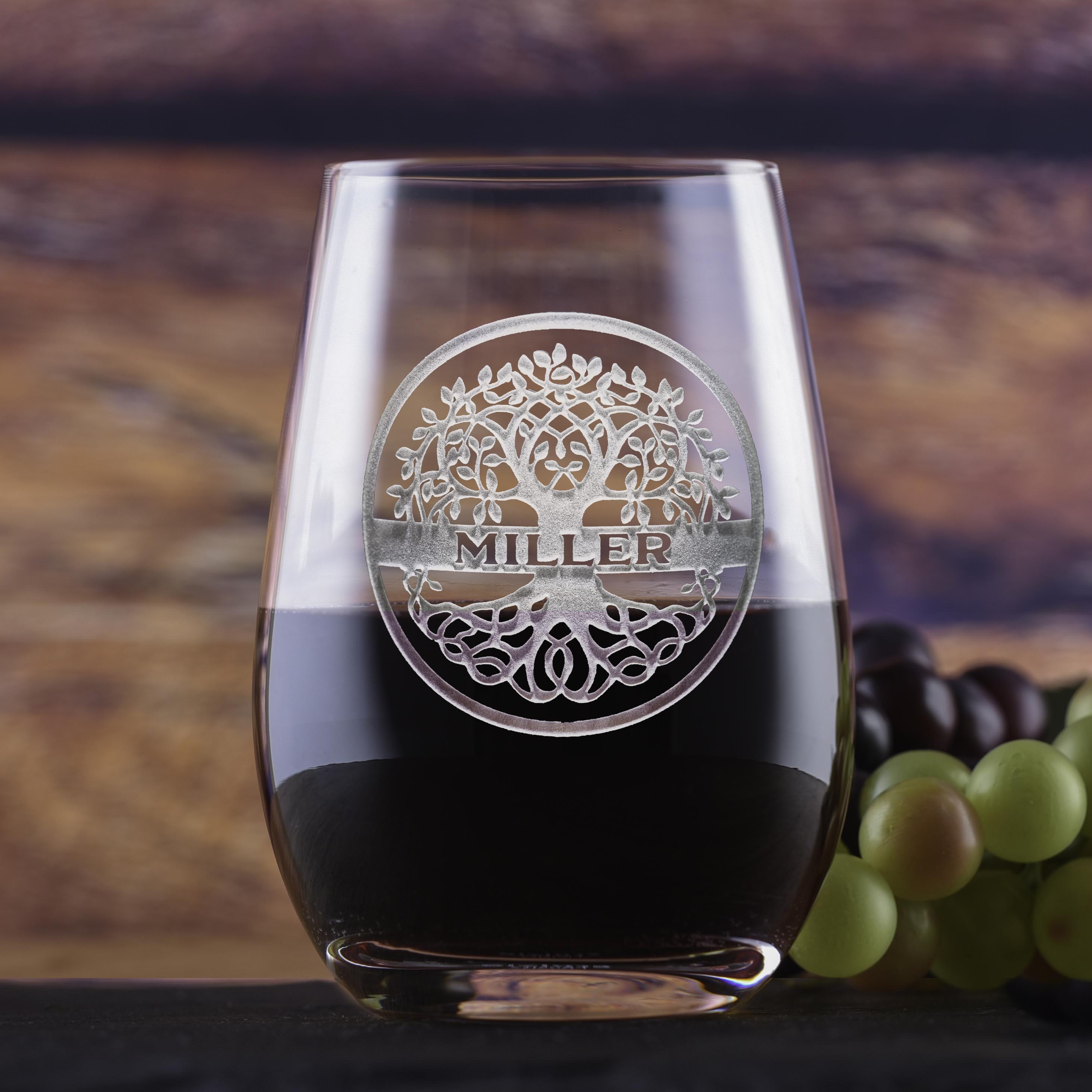Family Tree stemless wine glass tumbler. This Stolzle crystal 16.5 oz. stemless wine glass tumbler, deeply etched and personalized by Crystal Imagery will be the gift you will love to give or get! Custom engrave your monogram or company logo while delivering the quality you've come to expect from Stolzle. Crystal Imagery prides ourselves with providing a deep-relief, 3D finish when we custom engrave your barware gifts. Our artisans use a sand-carving method that can't be matched by laser engravers and etchers. We blast away a background panel around the monogram or logo to create a finish that is jaw-dropping. It's beautiful and natural at once, giving your table and party a classic elegance. Use it to serve wine, cocktails, soft drinks, and water. The versatile size makes it a favorite for nearly every occasion.