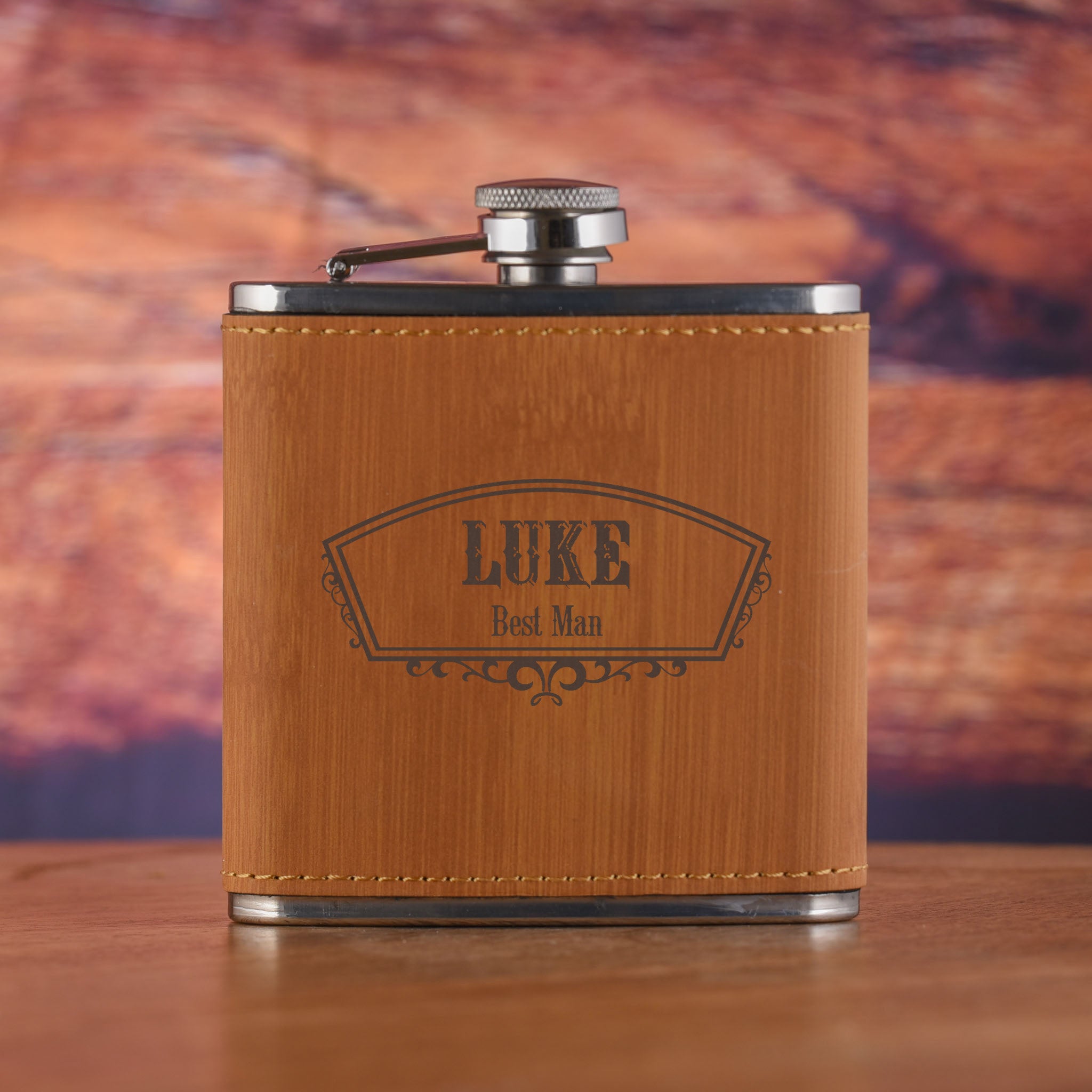 Our groomsman and best man bamboo custom pocket flask gift is engraved with the name of your groomsman and his title. This 6 oz engraved faux bamboo flask offers the look and feel of genuine leather at a fraction of the price. This richly textured, synthetic material is spot resistant, easy to clean and durable enough for the rigors of daily use. The high quality workmanship of each faux leather piece is sure to impress every recipient with its elegant individuality. This rich finish is sure to impress every recipient with its elegant individuality.
