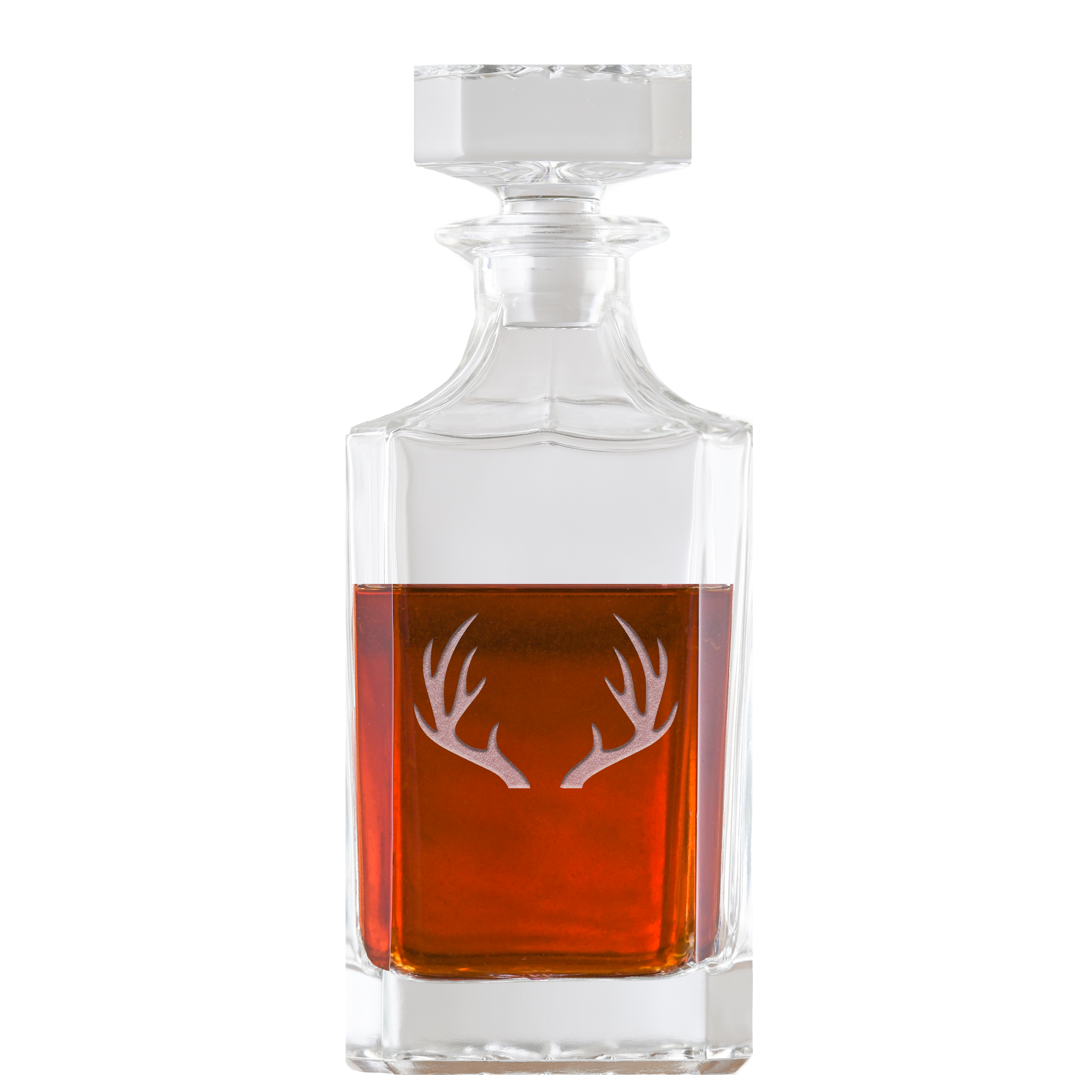 Custom engraved square whiskey decanter gift featuring deer or elk antlers is deep etched making it a cool birthday, Christmas, wedding, or anniversary gift for the bride and groom and men or women. Show him or her your love and appreciation with this cool antler design deeply engraved into a heavy-weight high-quality scotch, bourbon, or whiskey decanter. Our deep-carved custom deer or elk whiskey decanter is a perfect custom-etched gift that will be cherished for years to come. Our master carvers will deeply sand carve the background design into the glass, leaving your lettering and design raised from the glass surface in a stunning 3D manner that is unmatched by simple engraving, etching, or screenprinting techniques. At 8.5" high, our custom deer or elk decanter with logo holds 26 oz of your favorite spirit.