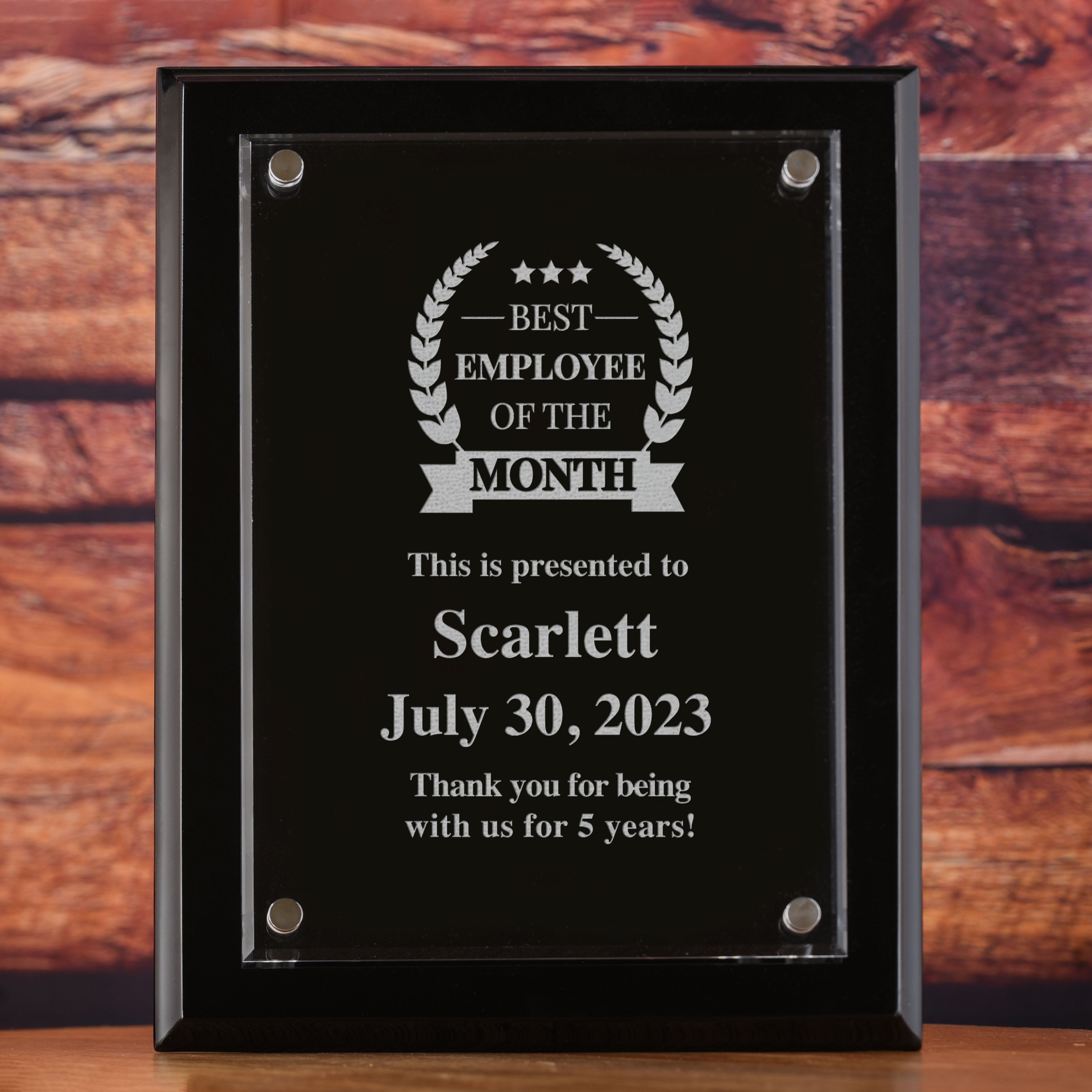 Employee of the Month recognition award is beautifully engraved on this high gloss black wall plaque with etched glass overlay, is the best award plaque you could give your recipient. This is also a perfect gift for Christmas or holiday events for your employees, special clients, customers and colleagues.