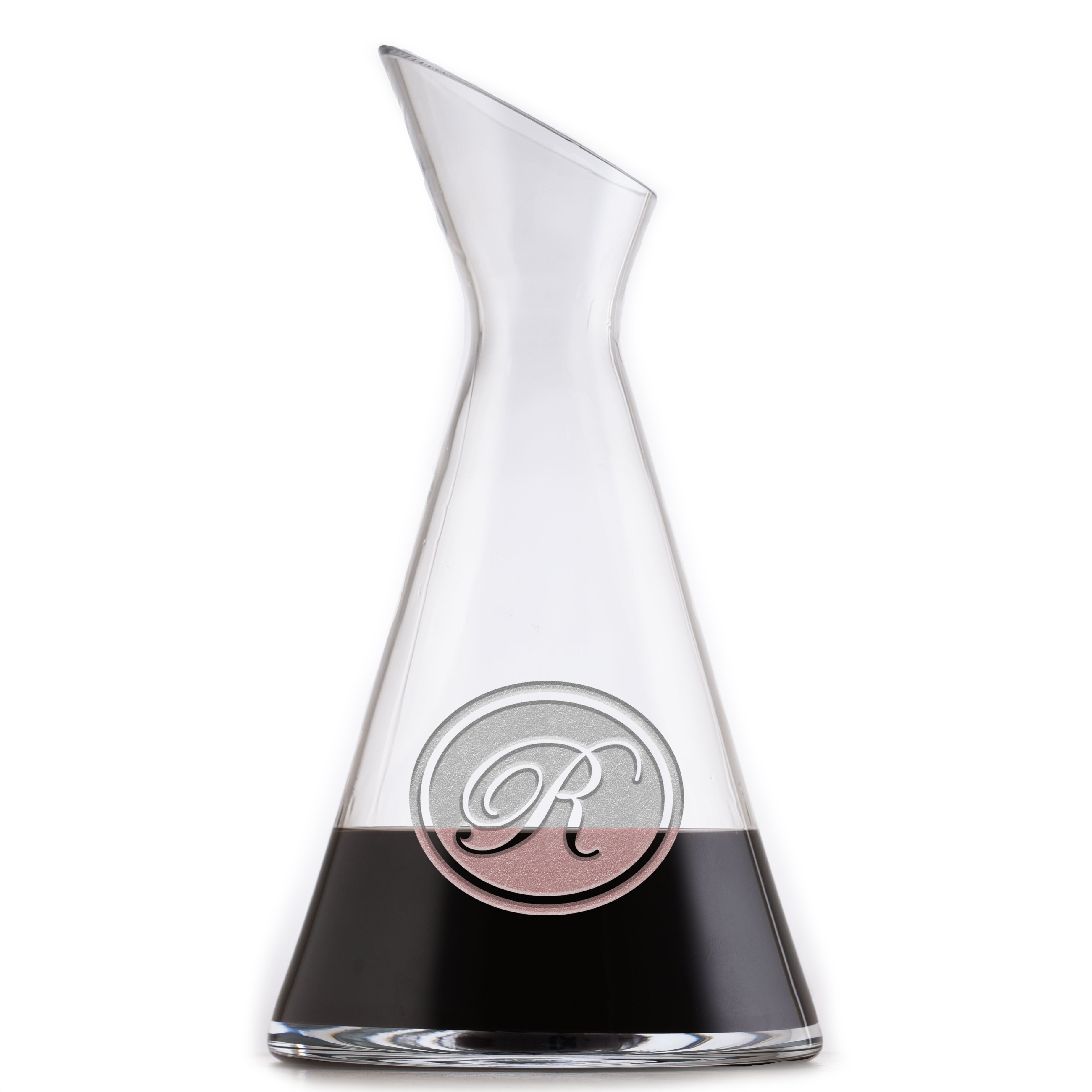 Engraved Monogram Slant Wine Carafe Decanter custom personalized by Crystal Imagery. Serve wine, water, and other beverages with impeccable style in this etched Stolzle 86506 / 500091 slant 26.5 oz. glass decanting carafe! Crystal Imagery takes pride in providing a deep-relief, 3D finish when we custom engrave your barware gifts. Our artisans use a sand-carving method that canÕt be matched by laser engravers and etchers. We blast away a background panel around the monogram or logo to create a finish that is jaw-dropping. Pour beverages with elegance at your dinner table or cocktail party with this 100% lead free crystal decanter. This Stolzle glass provides higher clarity and brilliance than other glassware containing lead. Its beauty is matched by incredible durability. During production, the wine carafe undergoes a fire tempering process that increases hardness and durability, resulting in a strong carafe unlikely to break. To wash your carafe, rinse it with warm water. Refrain from using any detergents as it may affect the taste of wines stored in the decanter.